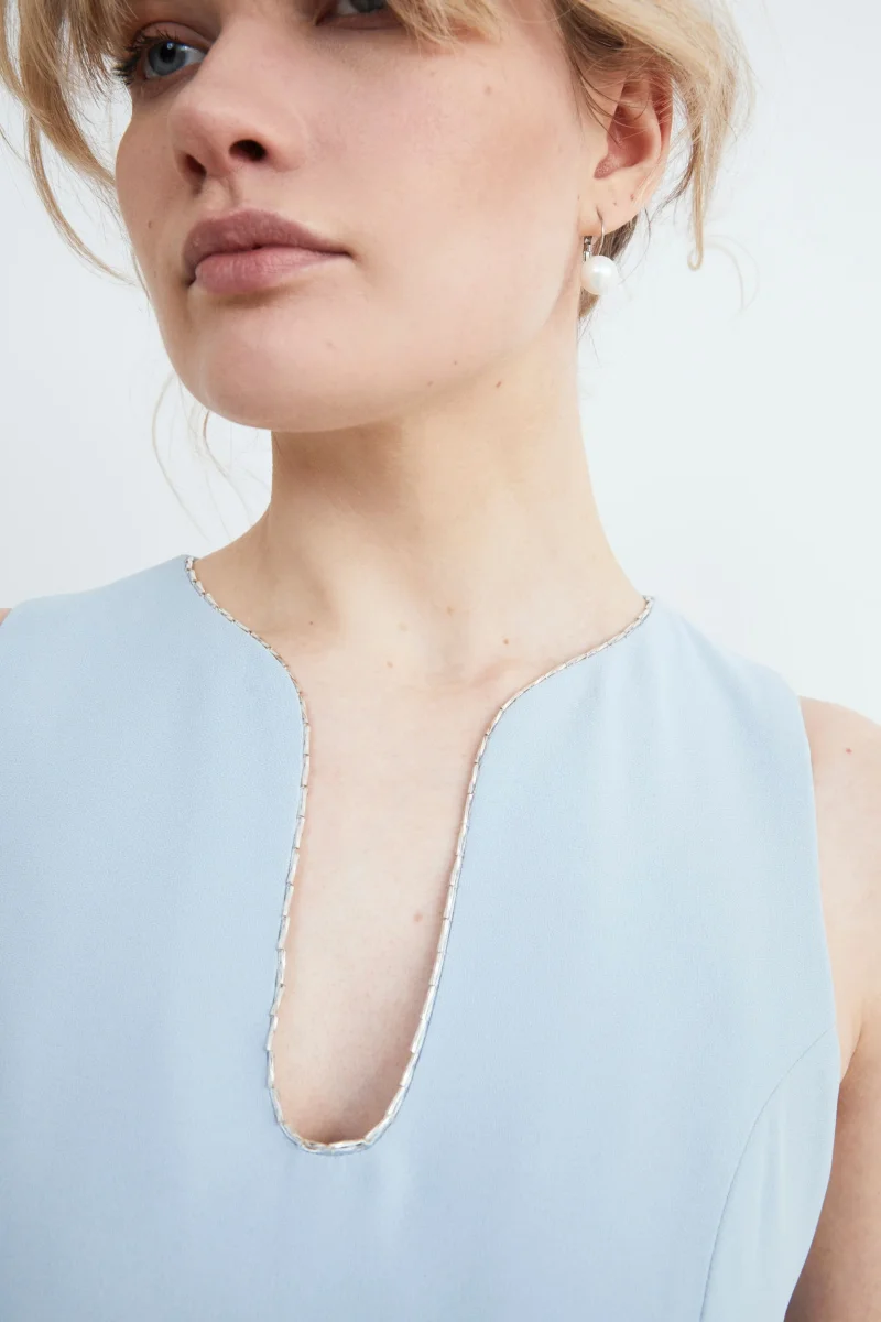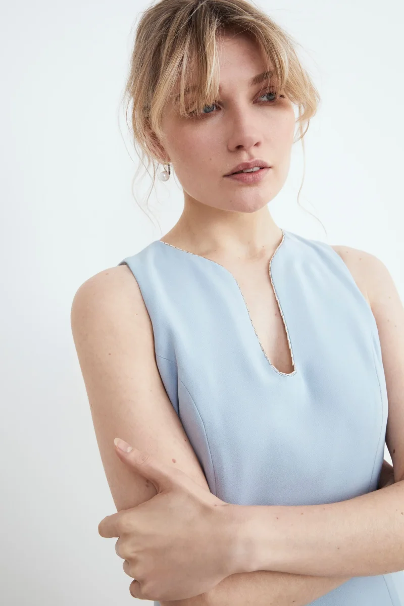 Vestito azzurro a tubino elegante, lunghezza midi fino al ginocchio. Lโabito รจ perfetto per le cerimonie, abbinato con la stola Il Lanificio della stessa nuance. Made in italy. La modella รจ alta 1.75 e indossa la taglia 40. Vestibilitร regolare.