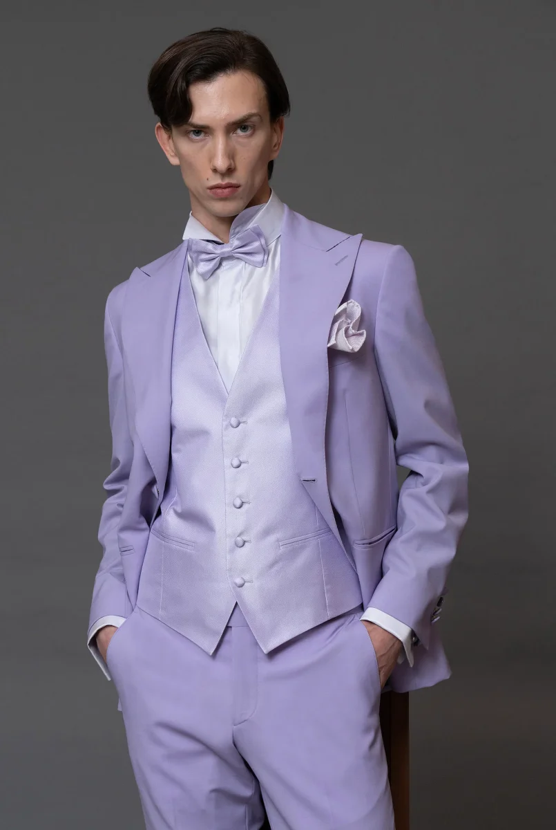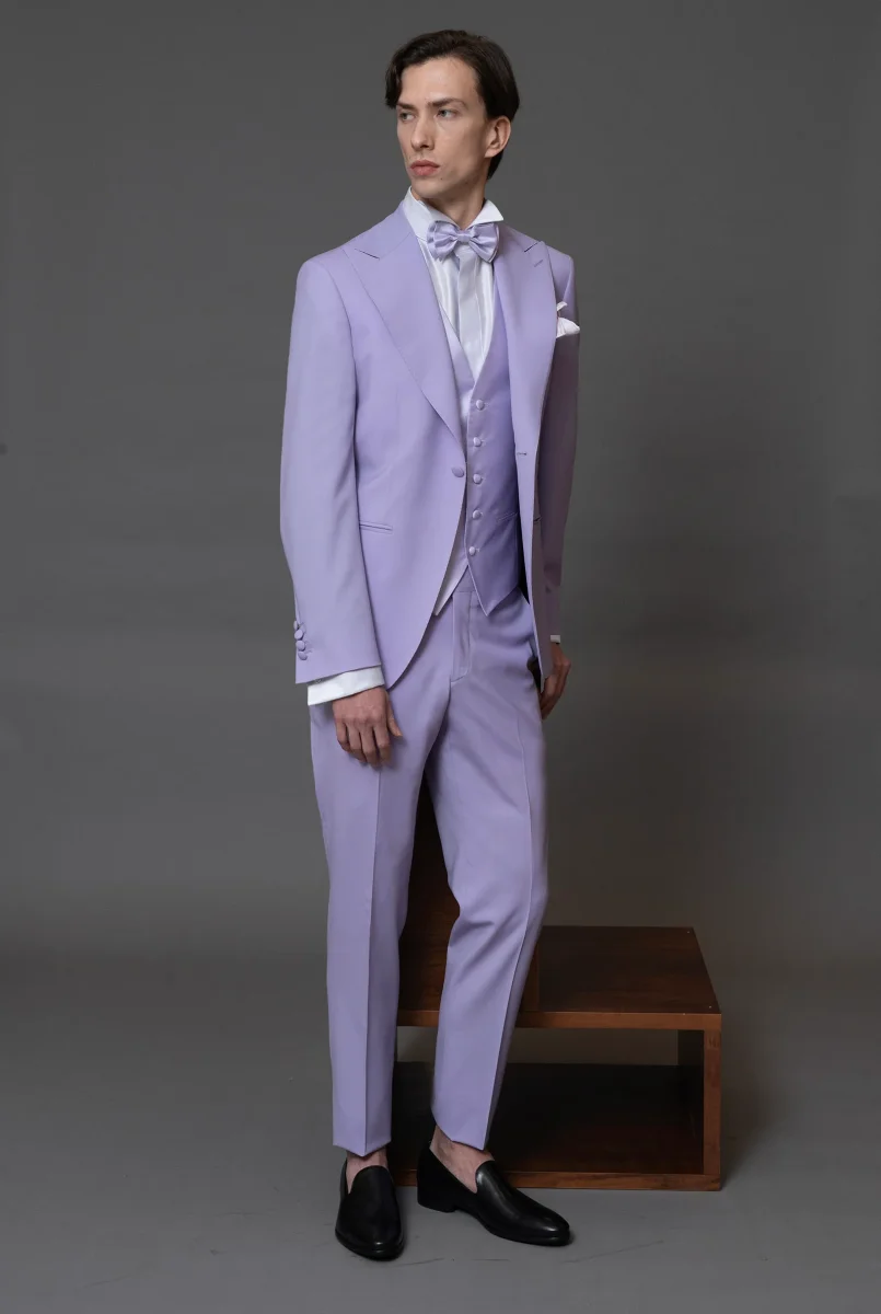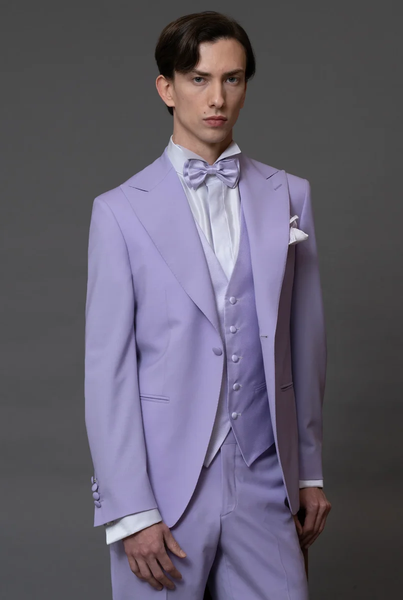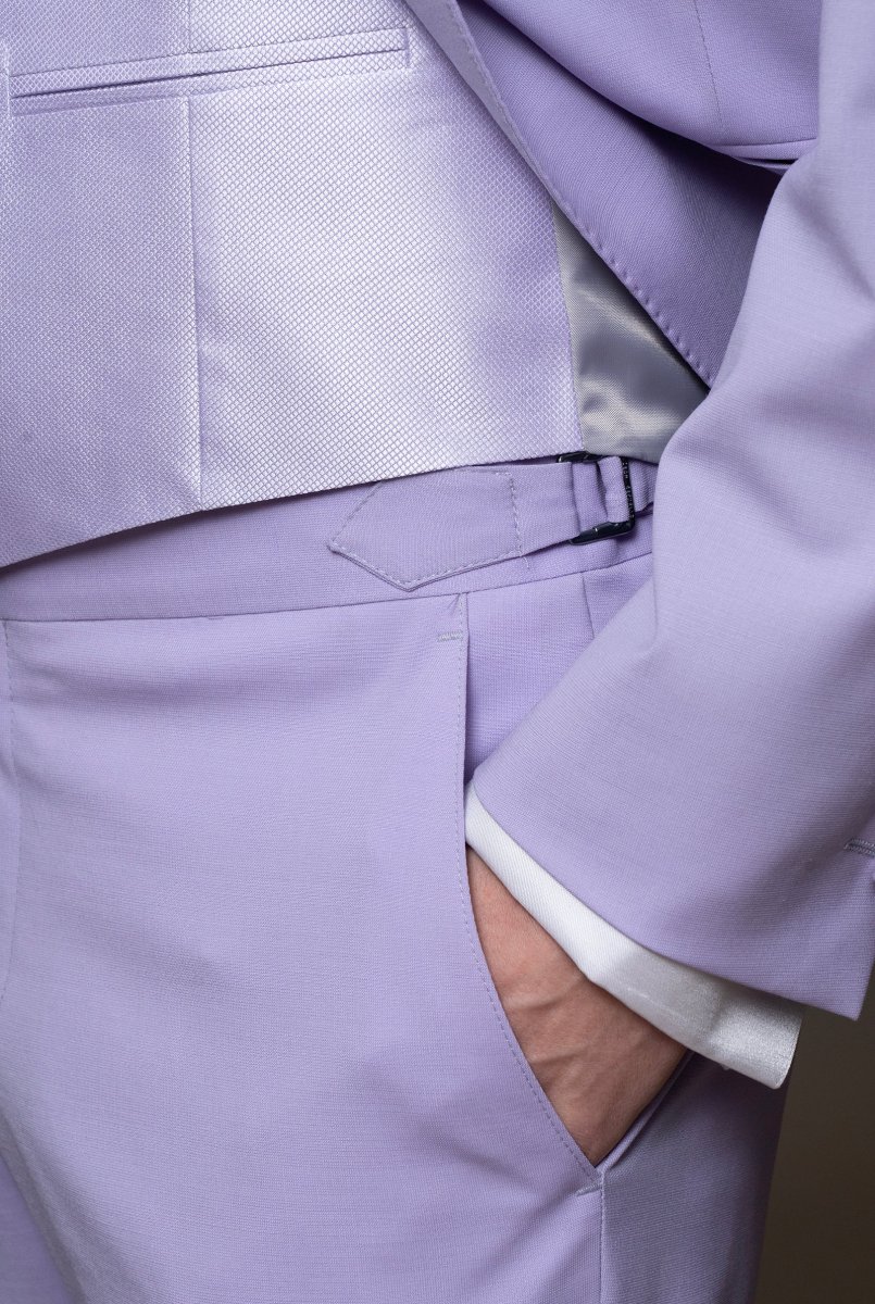 Abito cerimonia un bottone, rever a lancia in lana finissima lilla, pantalone con fibbia di regolazione laterale