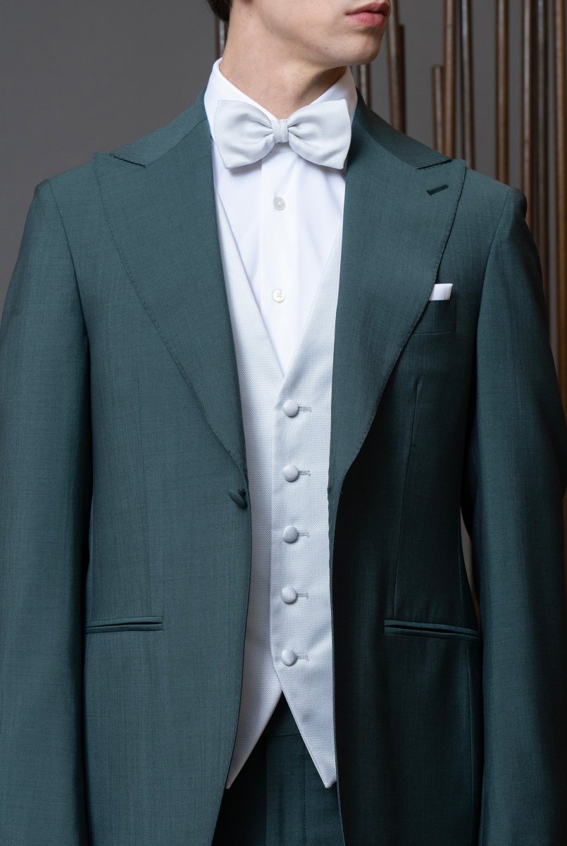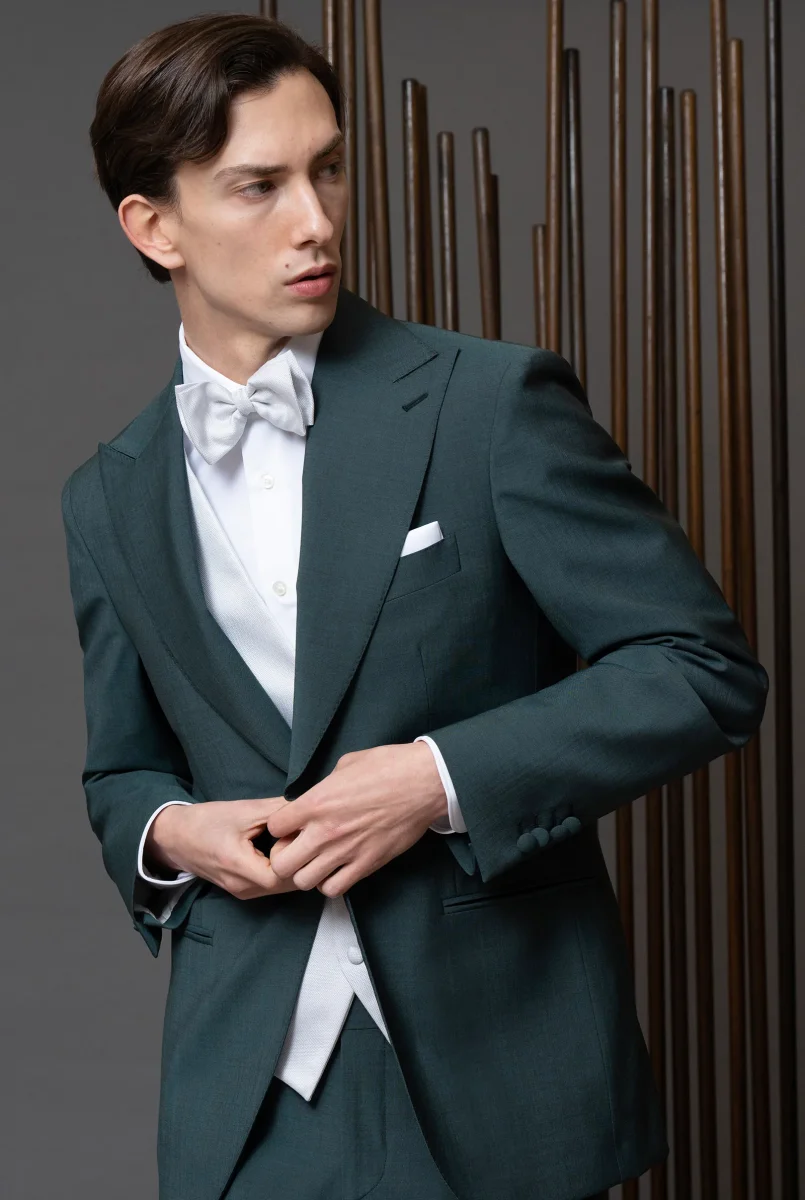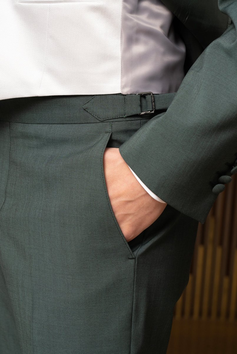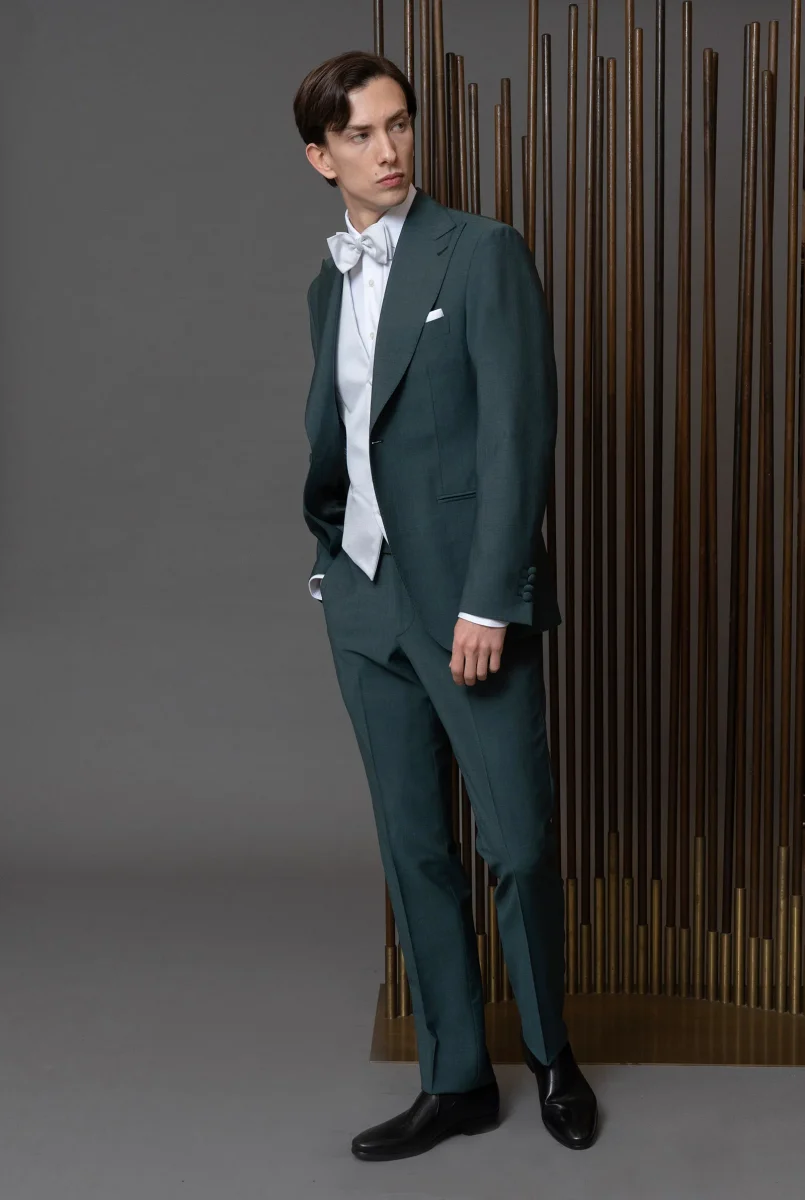 Abito cerimonia un bottone, rever a lancia in lana finissima verde foresta, pantalone con fibbia di regolazione laterale