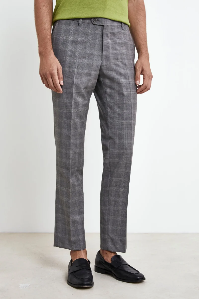 Abito check grigio da uomo in lana vergine con motivo Principe di Galles, eleganza senza tempo per ogni occasione. Rinnova il tuo guardaroba formale con questo abito da uomo grigio a quadri, realizzato in pura lana vergine e rifinito con un classico motivo Principe di Galles. La giacca monopetto, con revers classico, tasche con pattina e taschino a filetto per pochette, esprime uno stile raffinato e contemporaneo, ideale per cerimonie, appuntamenti business o eventi importanti. La vestibilitร  slim fit, unita al drop 8, valorizza la silhouette maschile, mentre il tessuto in lana garantisce comfort e calore durante tutta la giornata. Il disegno check aggiunge un tocco di personalitร  a un capo essenziale nel mondo dellโ€™abbigliamento per uomo elegante e moderno. Un must tra gli abiti uomo per chi cerca un vestito elegante da uomo che unisca tradizione sartoriale e stile attuale. Made in Italy. Il modello รจ alto 189 cm e indossa la taglia 50.