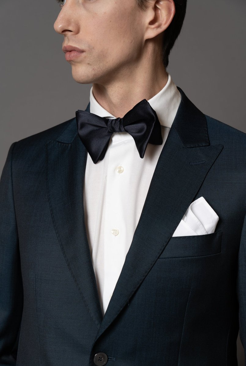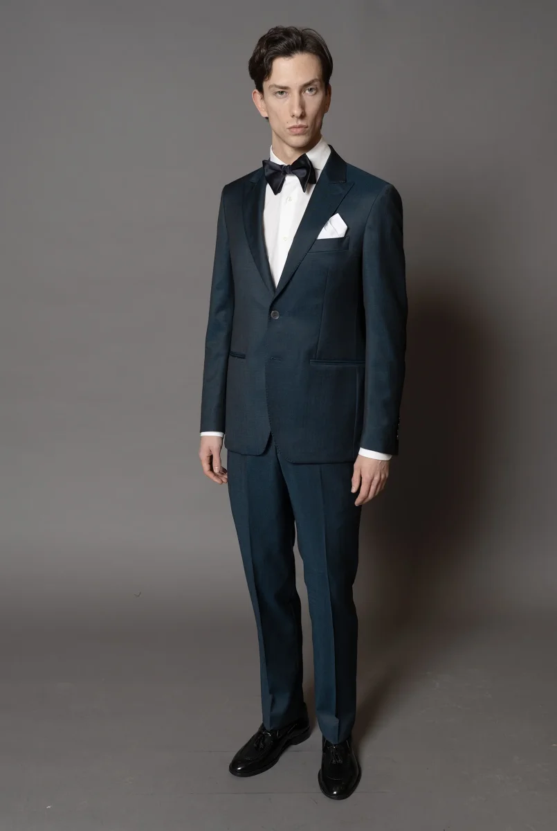 Abito classico con rever a lancia e 2 bottoni in madreperla, tasche a filetto e uno spacco centrale. Pantalone con fibbie laterali senza passanti. Tessuto in lana super fine con micro fantasia blu petrolio. Made in Italy. Guida alle Taglie