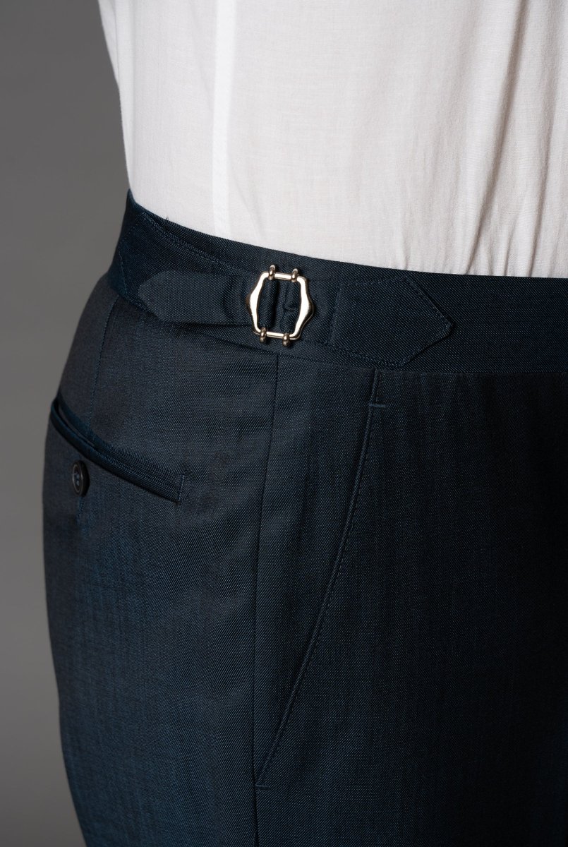 Abito classico con rever a lancia e 2 bottoni in madreperla, tasche a filetto e uno spacco centrale. Pantalone con fibbie laterali senza passanti.