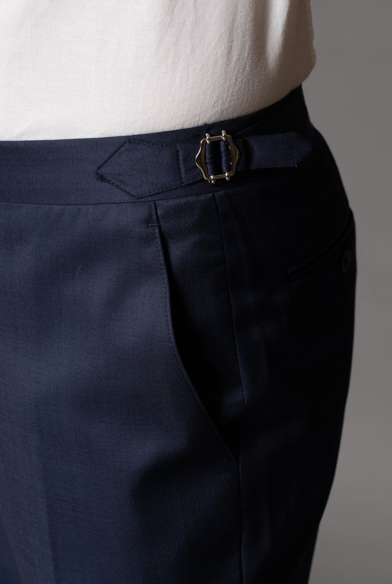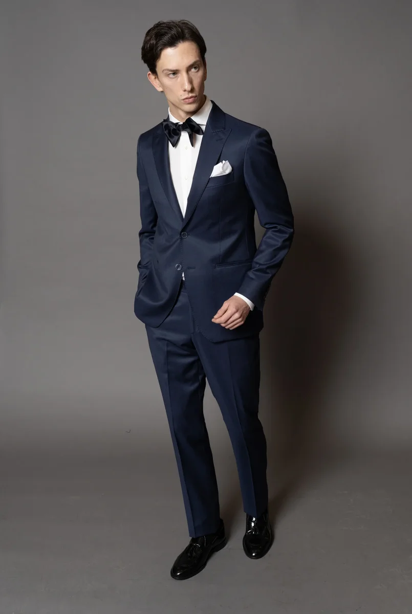 Abito classico con rever a lancia e 2 bottoni in madreperla, tasche a filetto e uno spacco centrale. Pantalone con fibbie laterali senza passanti.