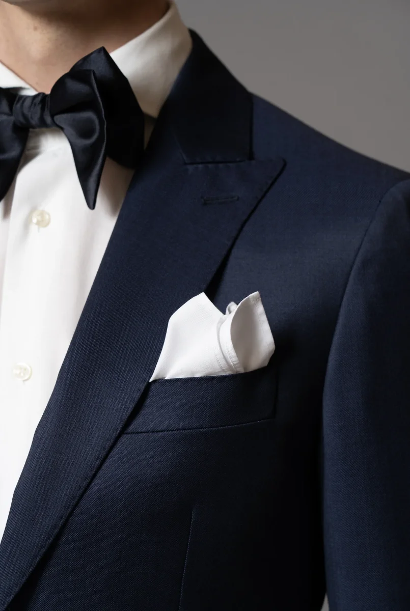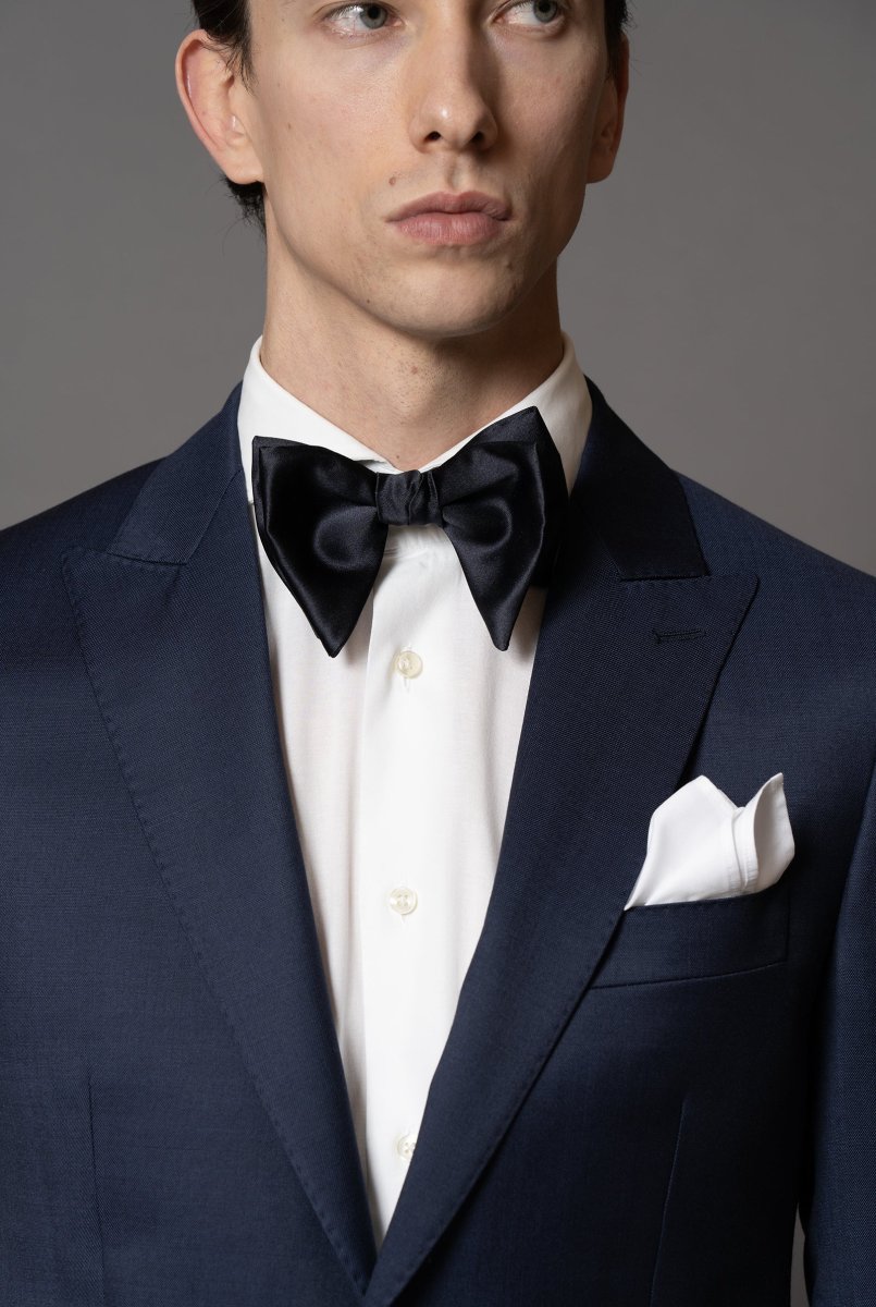 Abito classico con rever a lancia e 2 bottoni in madreperla, tasche a filetto e uno spacco centrale. Pantalone con fibbie laterali senza passanti. Tessuto in lana super fine con micro fantasia blu. Made in Italy. Guida alle Taglie