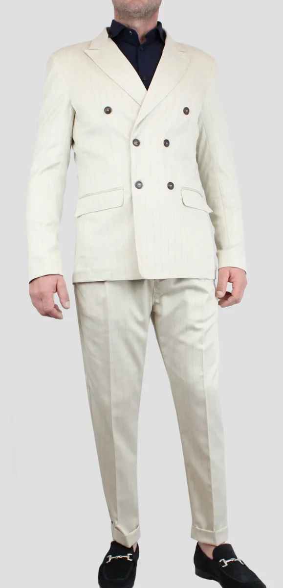 Questo elegante abito doppiopetto in colore panna gessato avana รจ un’aggiunta di lusso al tuo guardaroba. Il pantalone con pences e la giacca doppiopetto conferiscono un tocco di classe e raffinatezza, perfetto per occasioni speciali. Sentiti distinto e sofisticato con questo abito pregiato.