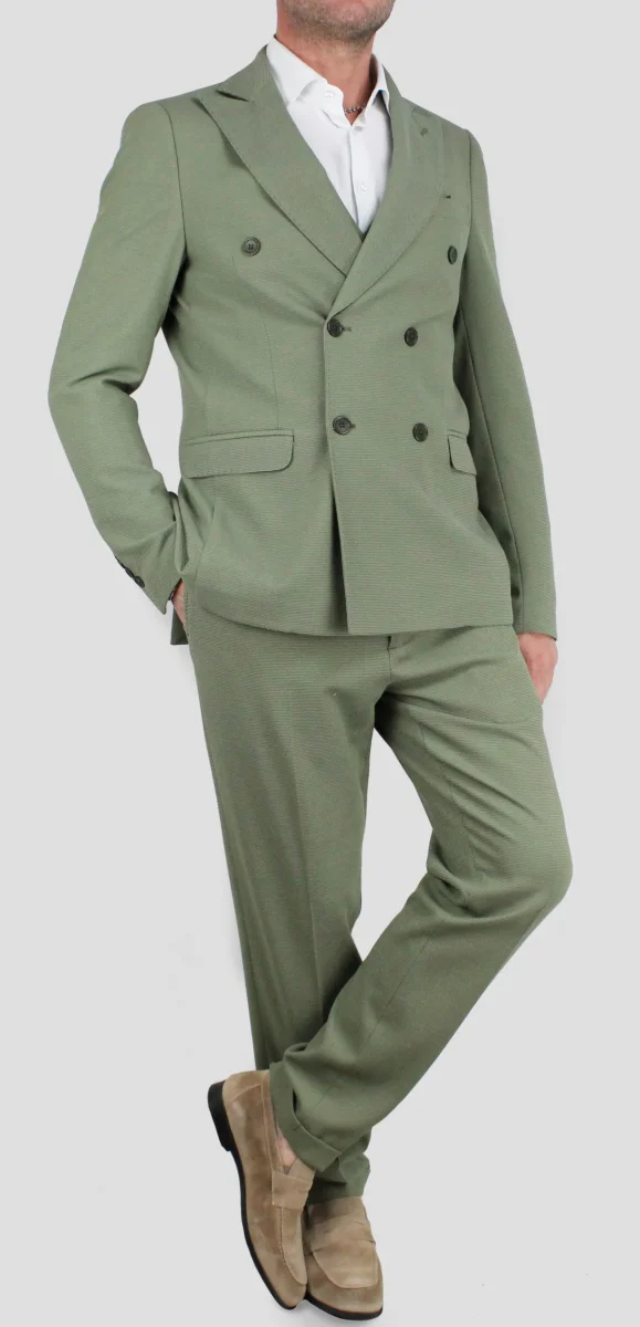 Abito cerimonia un bottone, rever a lancia in lana finissima verde acqua, pantalone con fibbia di regolazione laterale