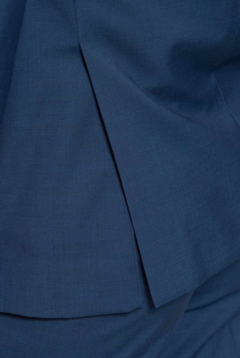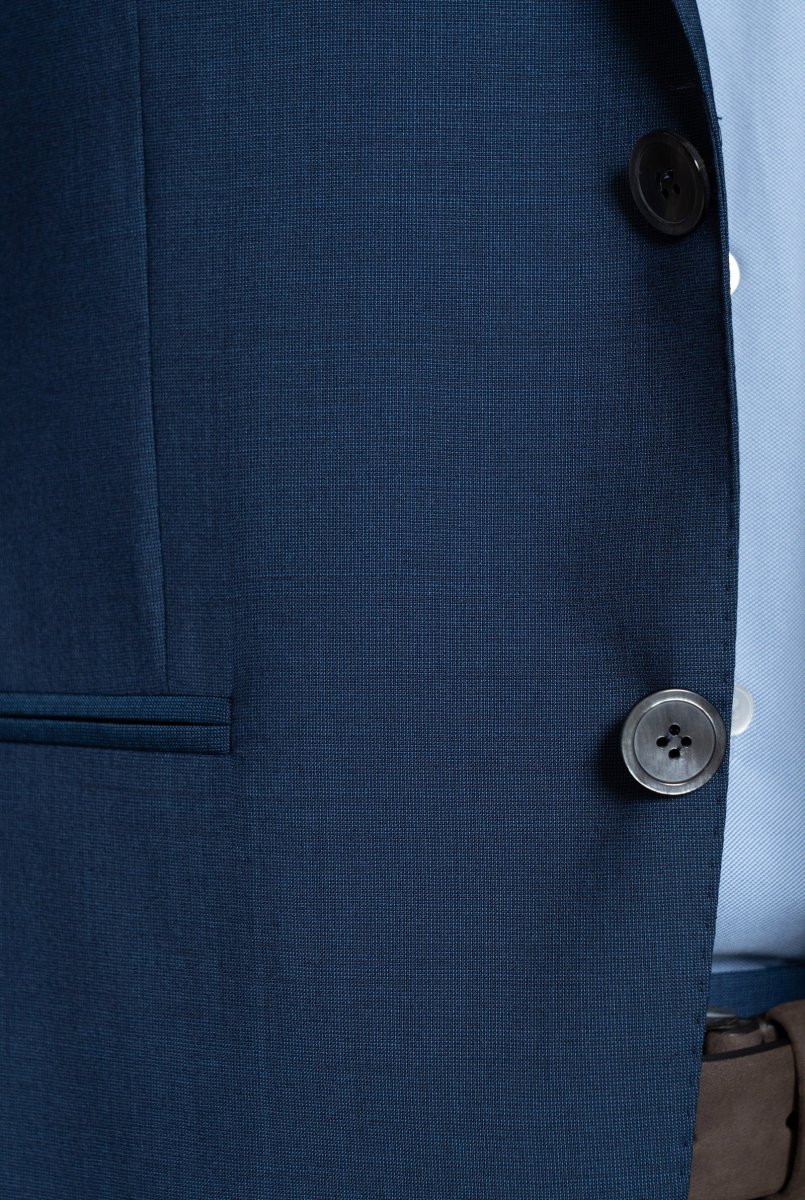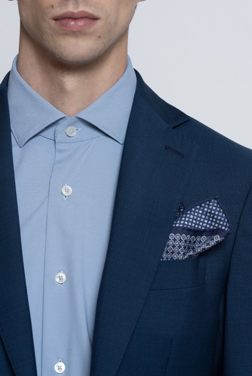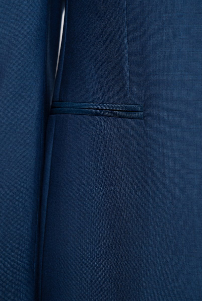 Rever collo classico, tasca per pochette e due tasche a filetto frontali. Due spacchi sul retro. Pantalone vestibilitร  slim fit, due tasche alla Francese frontali e due tasche a filetto con bottone sul retro.