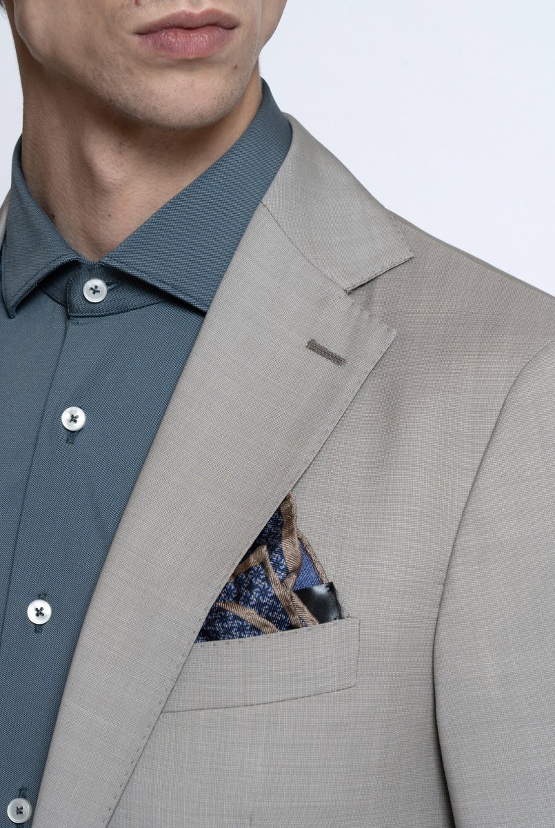 Rever collo classico, tasca per pochette e due tasche a filetto frontali. Due spacchi sul retro. Pantalone vestibilitร  slim fit, due tasche alla Francese frontali e due tasche a filetto con bottone sul retro.