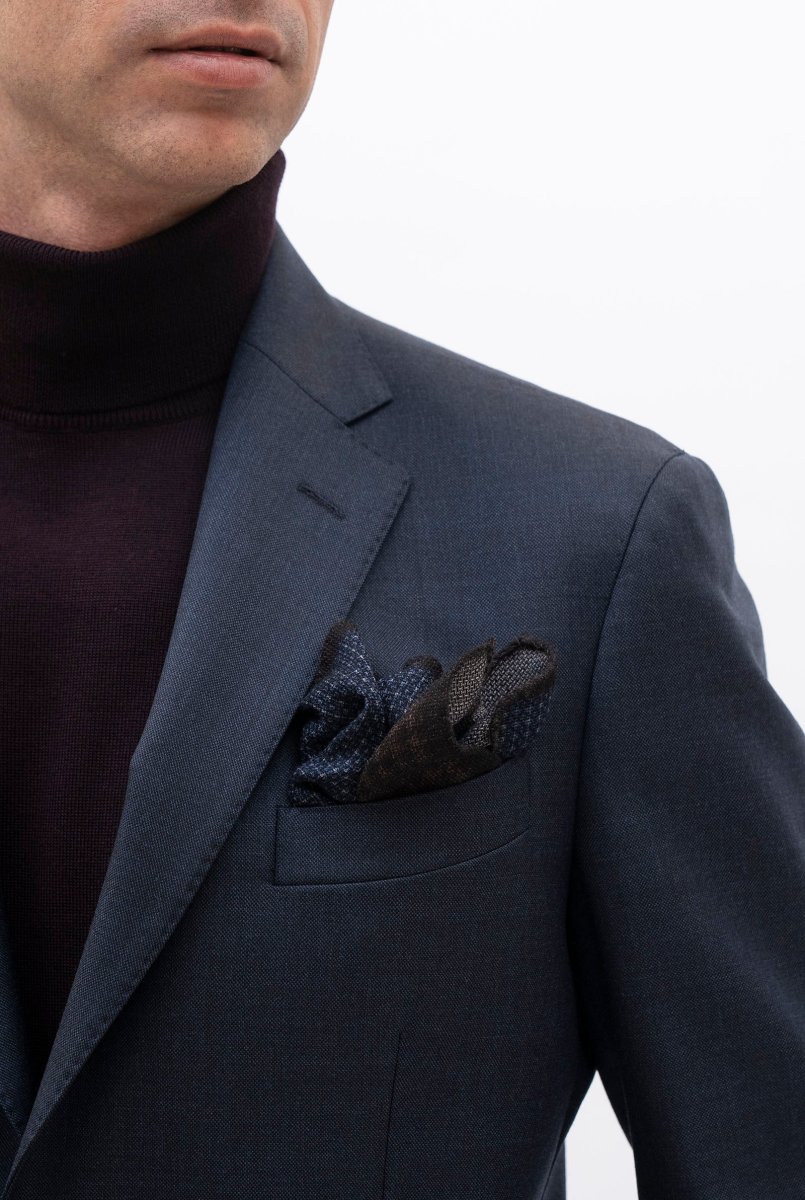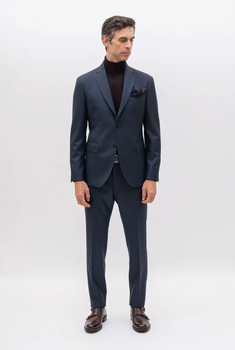 Abito in Grisaglia di Lana Color Blu Giacca due bottoni, rever classico, doppio spacco sul retro, taschino per pochette, completamente foderato. Pantaloni vestibilitร  slim, due tasche a filetto sul retro, due tasche alla francese sul fronte, possibilitร  di riprendere il fondo con risvolto o liscio. Il modello รจ alto 185 e veste una taglia 48 […]