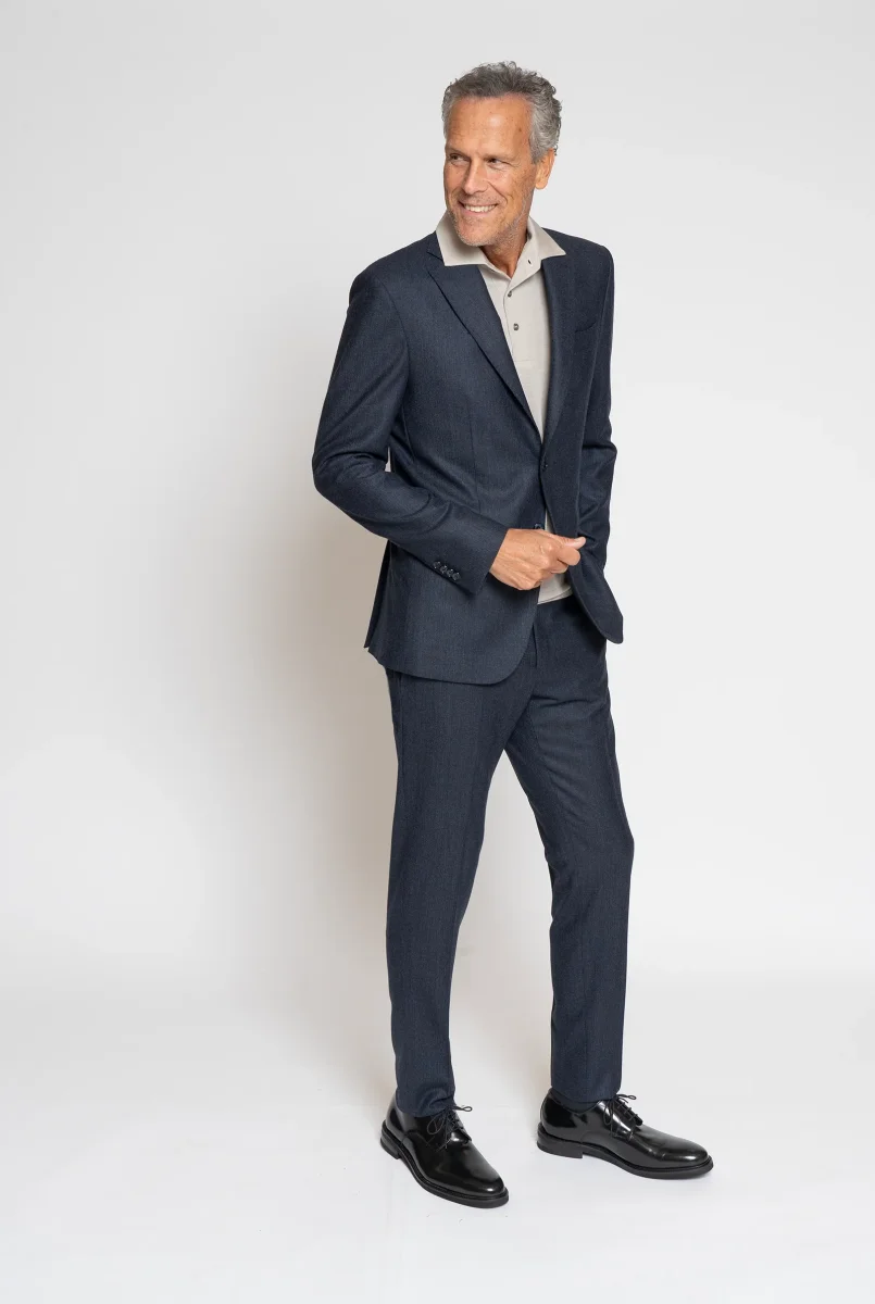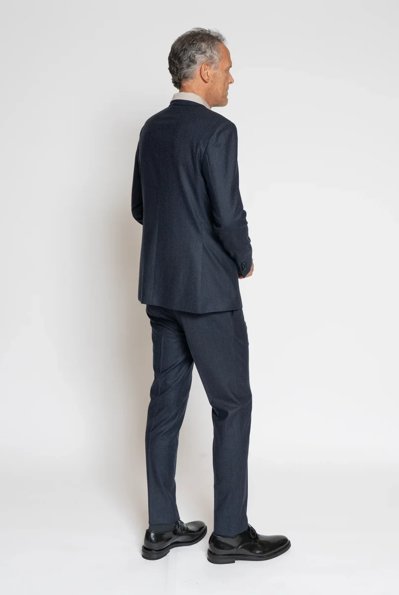 Elegante abito realizzato in Italia con tessuto Zignone composto al 90% da lana e al 10% da cashmere, perfetto per chi cerca un capo raffinato e confortevole. Il colore blu, dona un tocco di modernitร e profonditร al look. La giacca a due bottoni presenta un classico rever, taschino per fazzoletto, due tasche frontali con […]