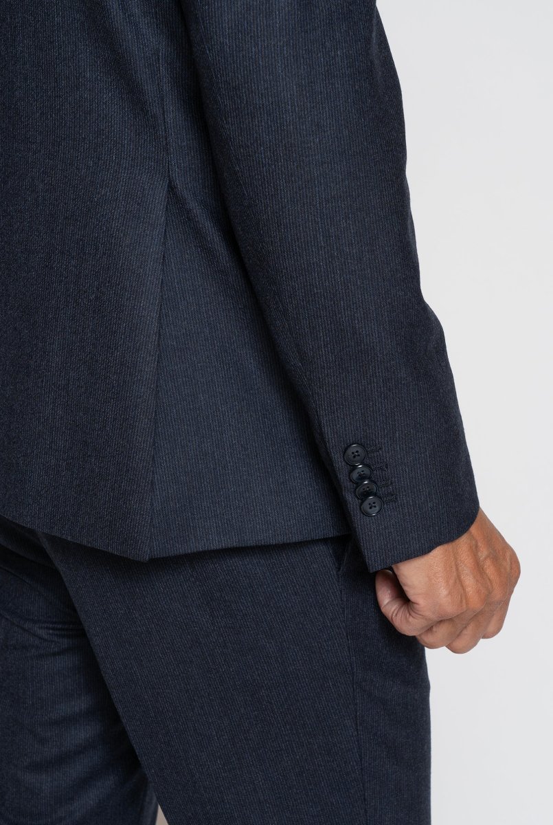 La giacca a due bottoni presenta un classico rever, taschino per fazzoletto, due tasche frontali con pattina e doppio spacco posteriore per una maggiore libertร di movimento. All’interno, sono presenti due pratiche tasche porta documenti.