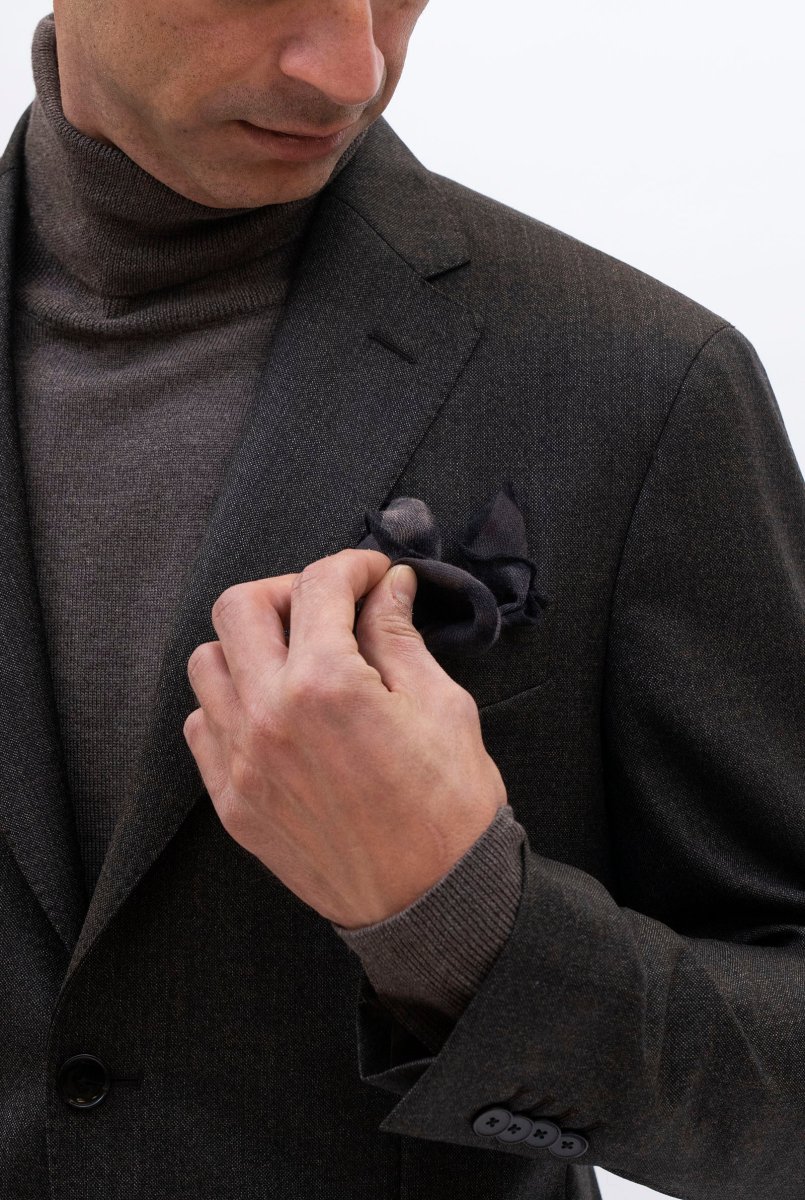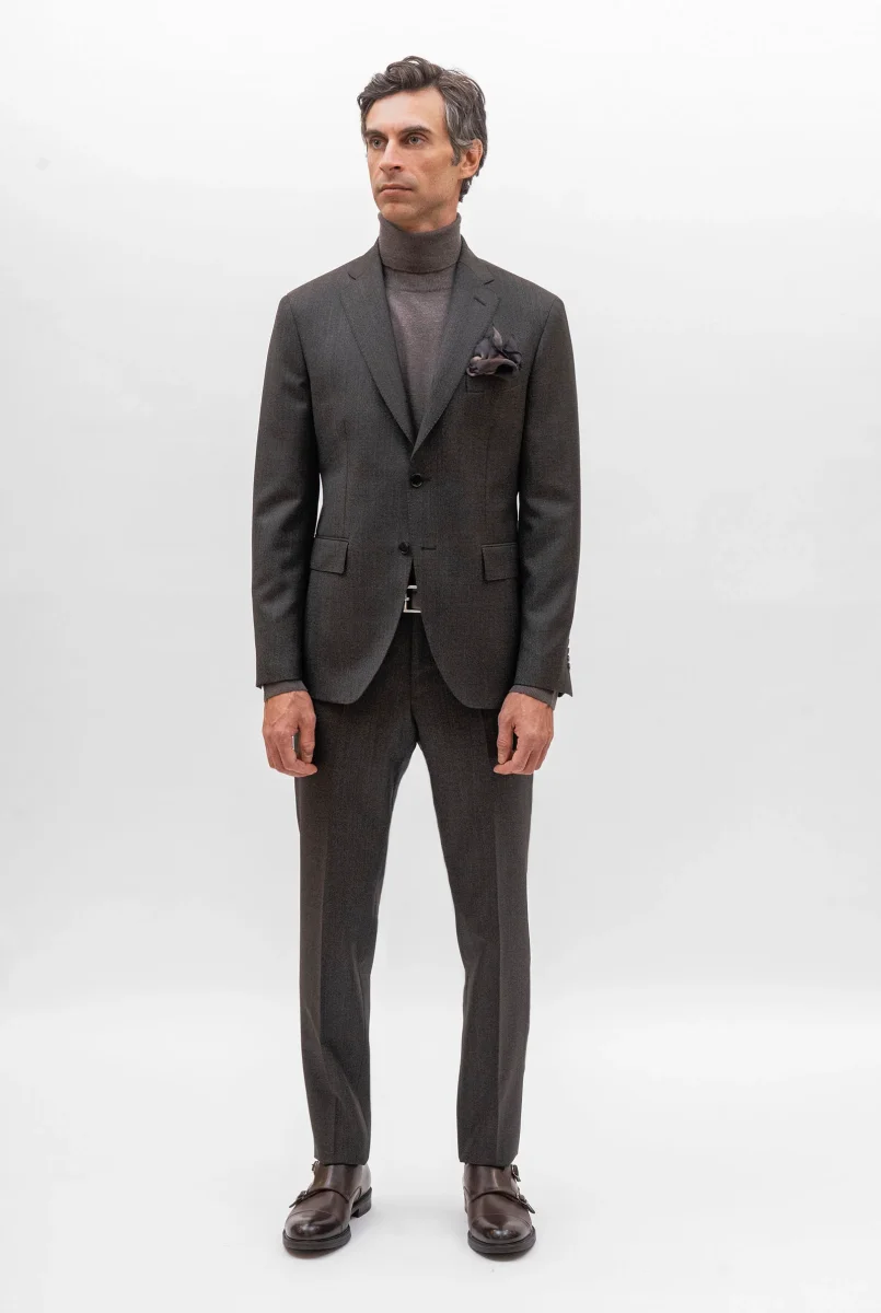 Abito in Grisaglia di Lana Color Marrone. Giacca due bottoni, rever classico, doppio spacco sul retro, taschino per pochette, completamente foderato. Pantaloni vestibilitร  slim, due tasche a filetto sul retro, due tasche alla francese sul fronte, possibilitร  di riprendere il fondo con risvolto o liscio. Il modello รจ alto 185 e veste una taglia 48 […]