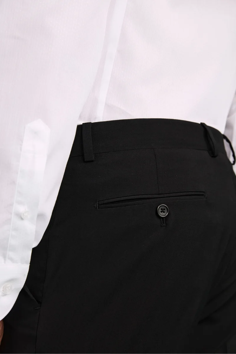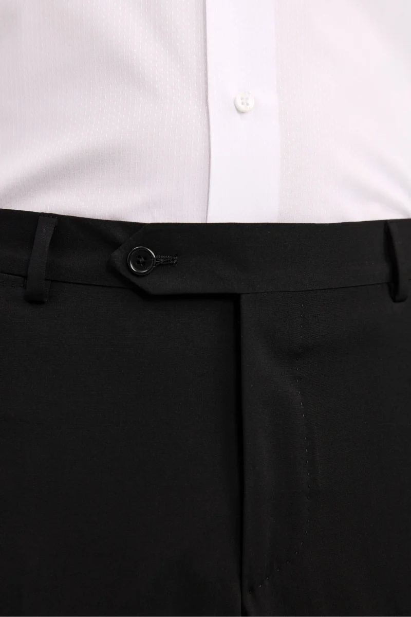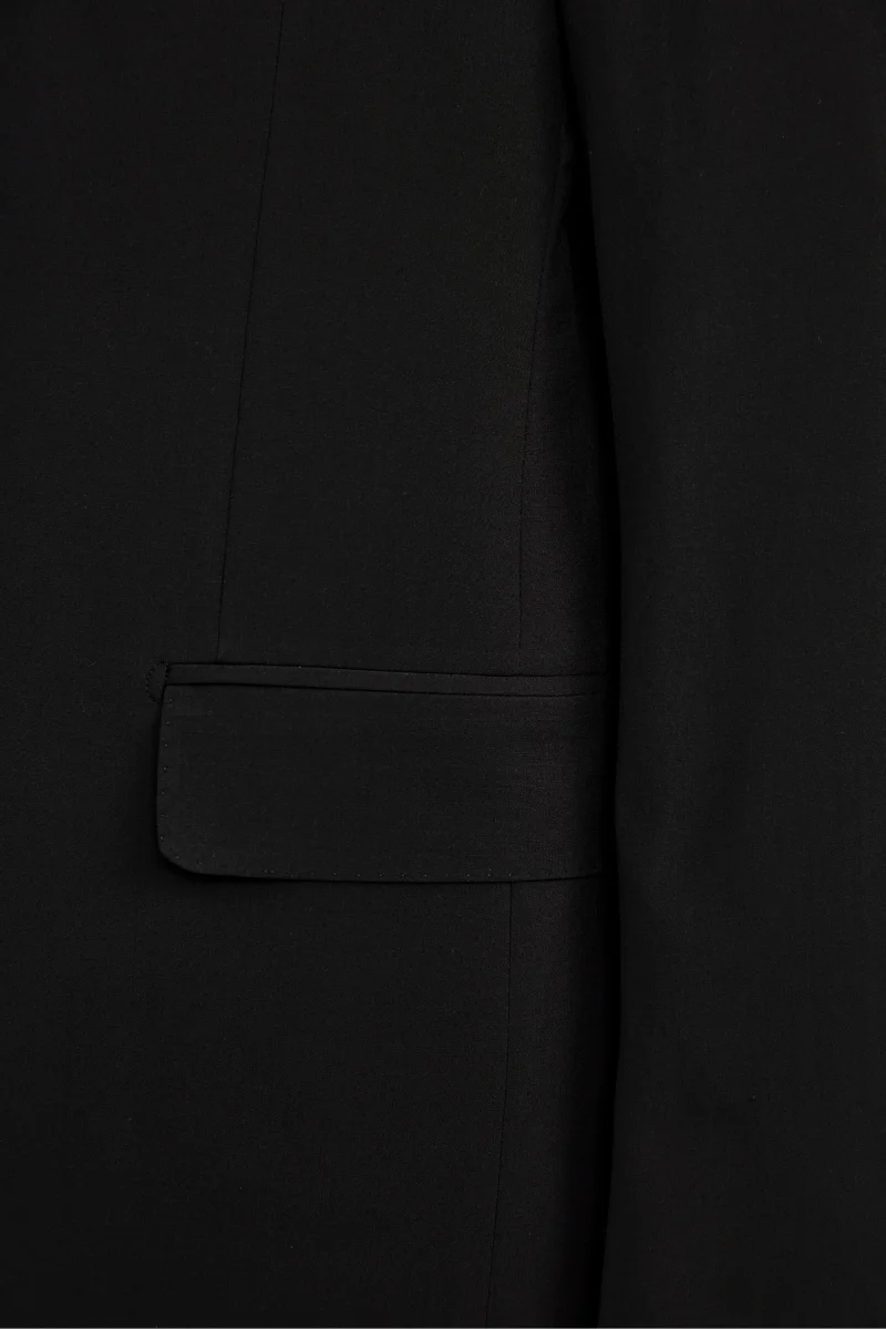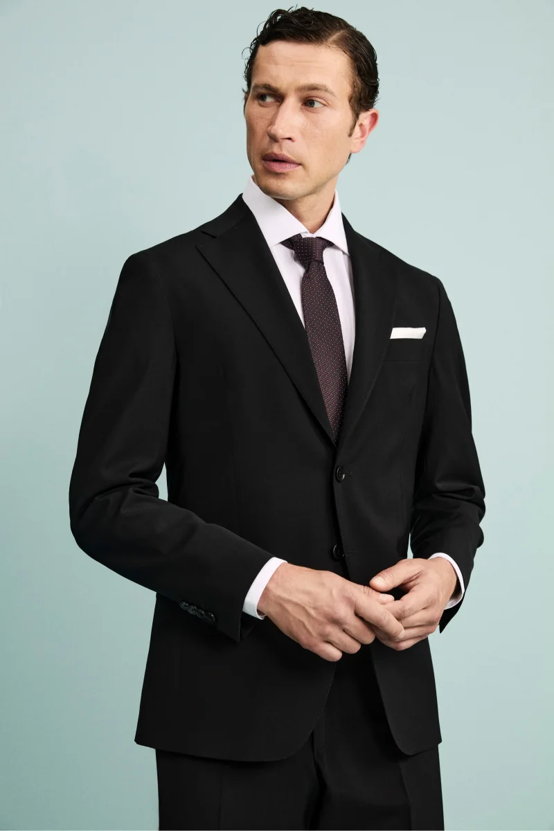 Realizzato in 100% lana vergine con lโ€™esclusivo tessuto Nobility 150โ€™s del Lanificio F.lli Cerruti dal 1881, questo abito da uomo รจ una scelta di eccellenza per cerimonie ed eventi speciali. Il colore nero, profondo e senza tempo, lo rende un must per ogni guardaroba formale. Completamente foderato e adatto a tutte le stagioni, garantisce struttura, traspirabilitร  e comfort. La giacca monopetto, con revers classico, รจ caratterizzata da chiusura a due bottoni, tasche con pattina anteriori, taschino a taglio sul cuore per la pochette e doppio spacco posteriore. I pantaloni presentano una chiusura anteriore con fibbia e bottone, passanti per cintura e tasche America, offrendo una vestibilitร  impeccabile e versatile. Parte della collezione IL Lanificio e Made in Italy, questo abito รจ perfetto con camicia bianca, cravatta in seta e scarpe stringate nere per un look formale di assoluta eleganza. Slim Fit e Drop 8. Il modello รจ alto 189 cm e indossa la taglia 50.
