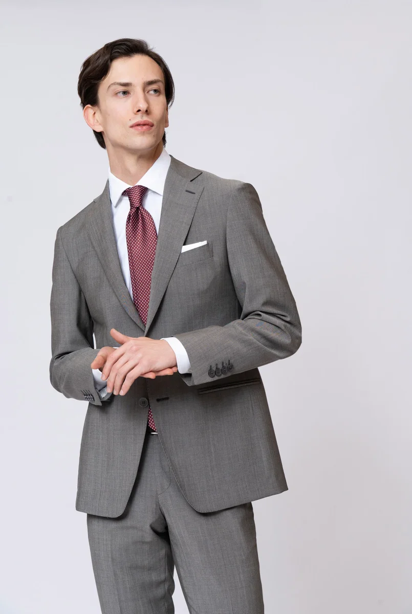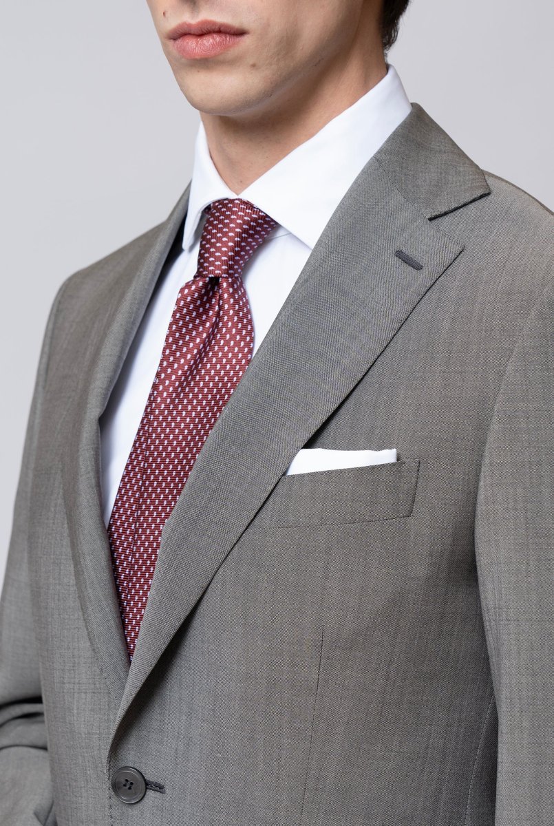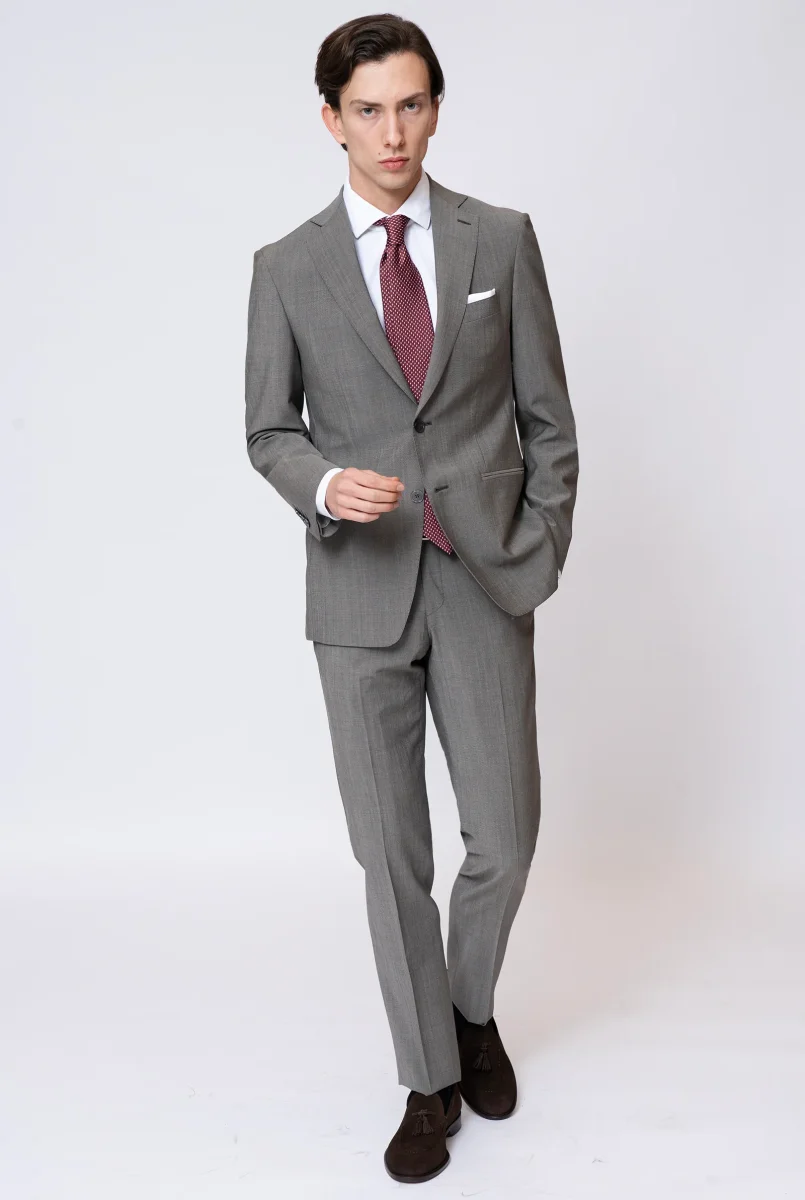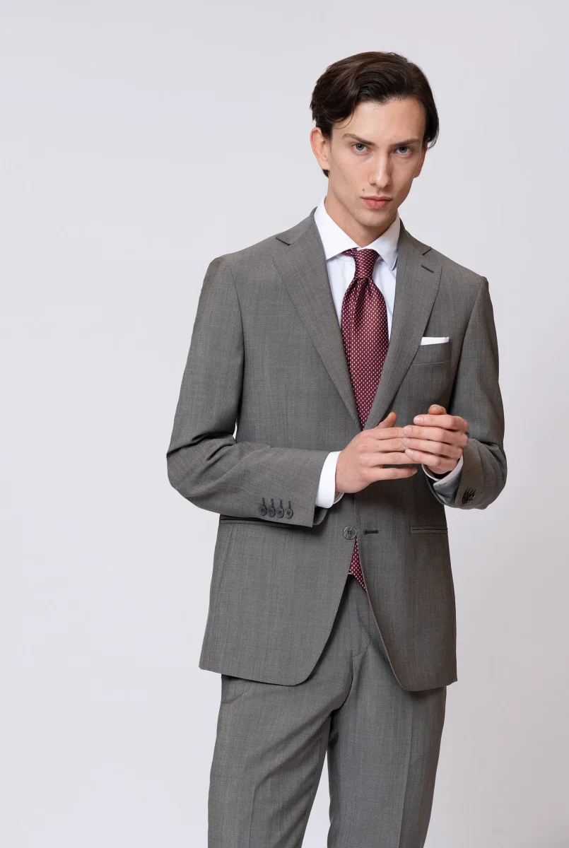 Giacca due bottoni, rever classico, taschino per pochette, tasche a filetto, doppio spacco sul retro, bottoni in madre perla.