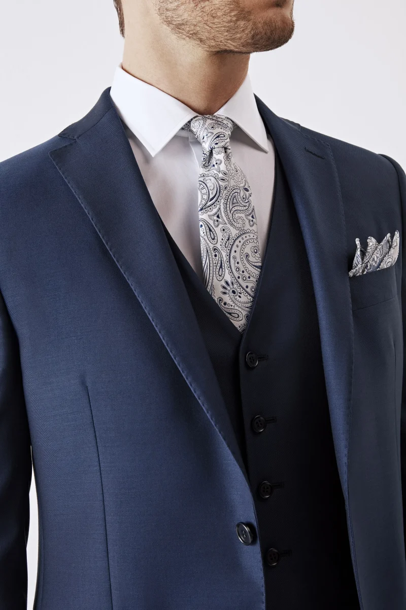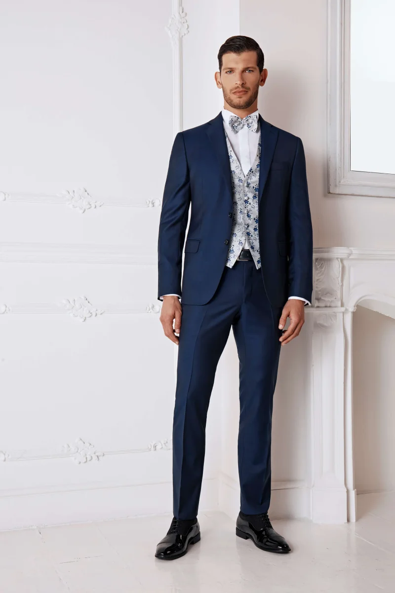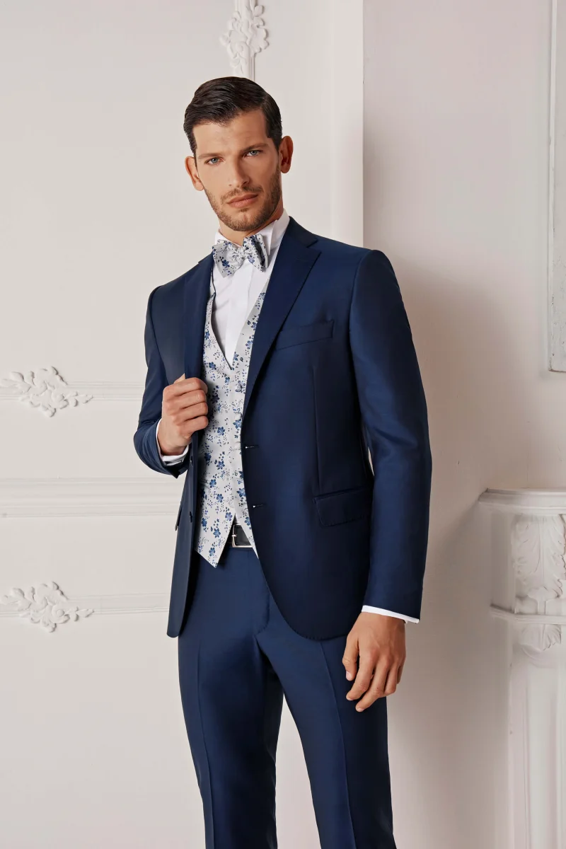 Abito slim da uomo in lana 150โS, il vestito da cerimonia perfetto per stile e raffinatezza Realizzato in lana finissima con lโesclusivo tessuto Nobility 150โS del Lanificio F.lli Cerruti dal 1881, questo abito blu da uomo รจ pensato per chi cerca un capo di alta qualitร da indossare nelle occasioni piรน eleganti. La giacca monopetto presenta rever classico, chiusura a due bottoni, spacchetti laterali e tasche a filetto con pattina, per una linea pulita e sofisticata. La tonalitร blu cangiante rende questo abito un’ottima scelta come vestito da cerimonia uomo, ma anche per eventi formali o look business di livello. La vestibilitร slim con drop 8 valorizza la figura mantenendo il massimo comfort. Un abito sartoriale Made in Italy, parte della collezione IL Lanificio, versatile da abbinare con camicie bianche, cravatte in tinta o mocassini lucidi per uno stile impeccabile. Il modello รจ alto 188 cm e indossa la taglia 50.