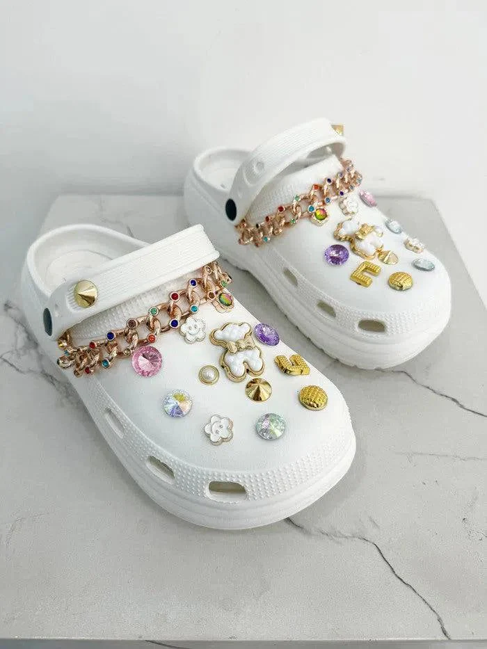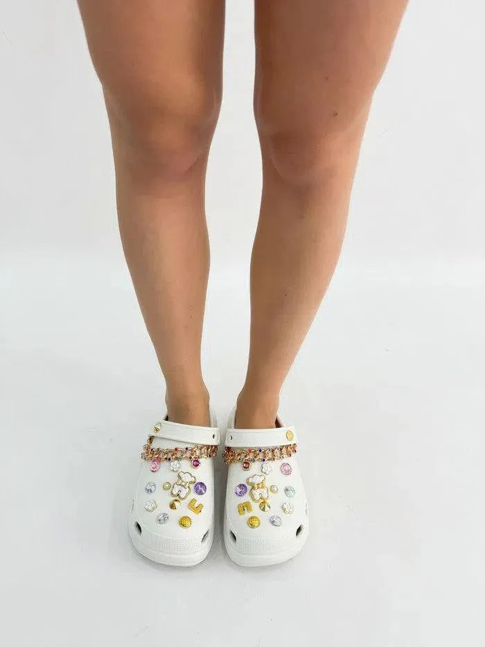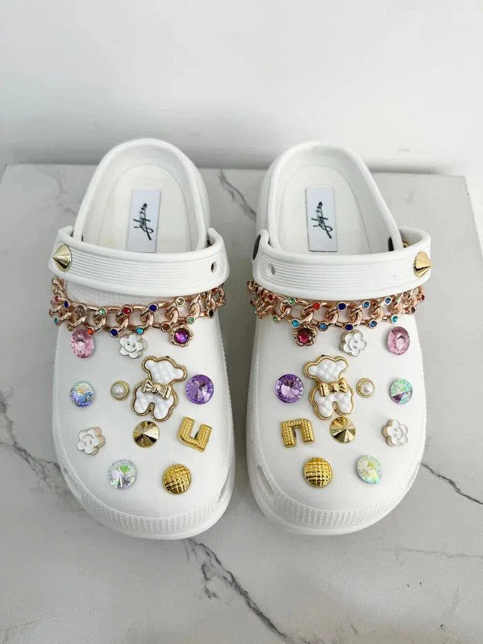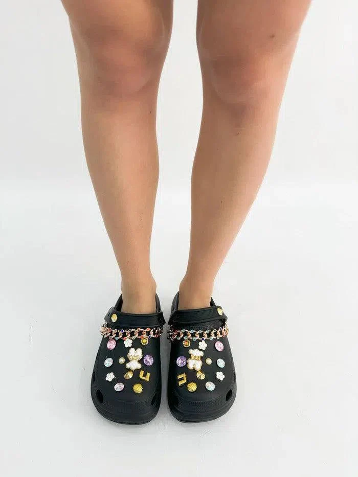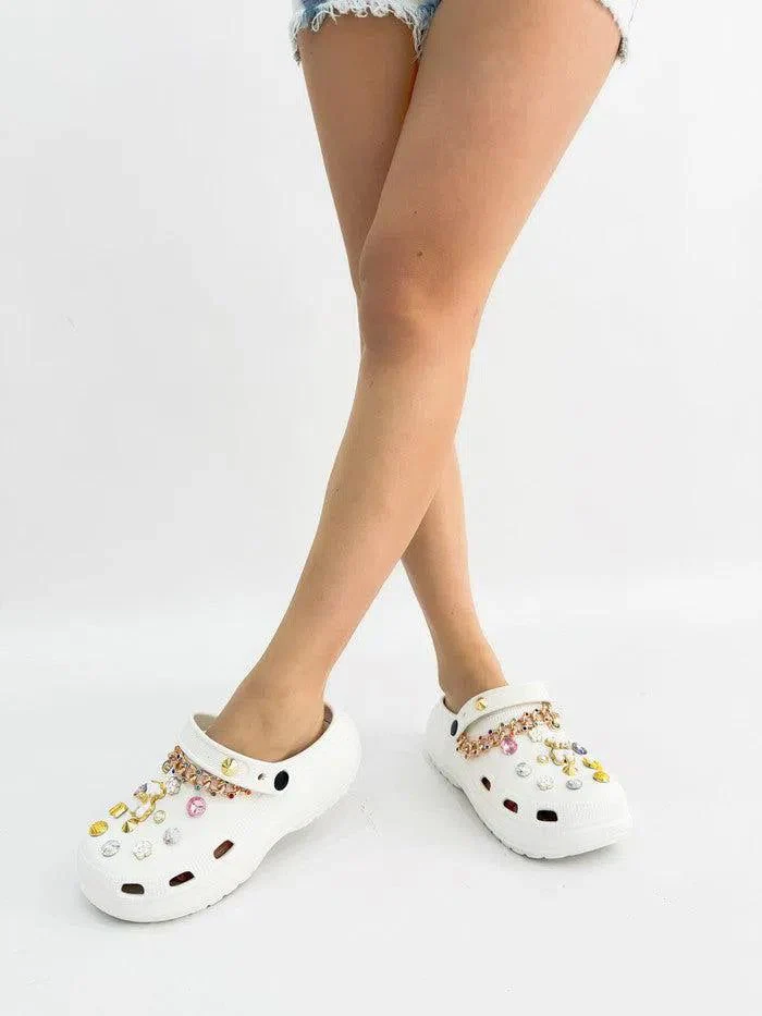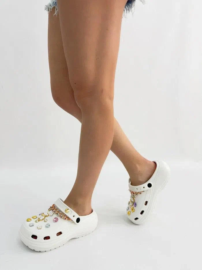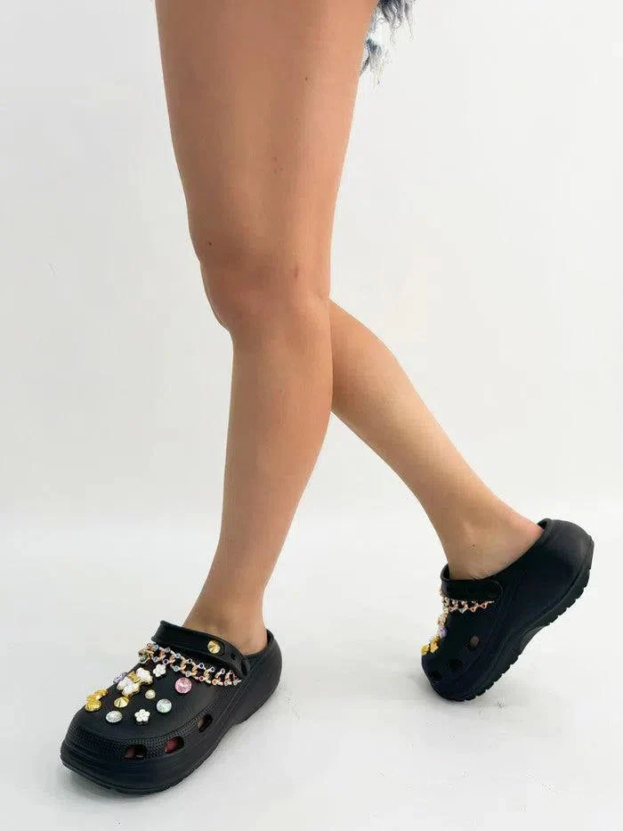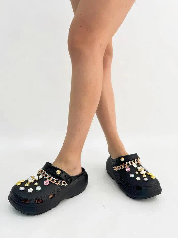 Acquista ora le ciabatte platform in gomma “Adriana” con gioielli e pietre per un look glamour e comodo.