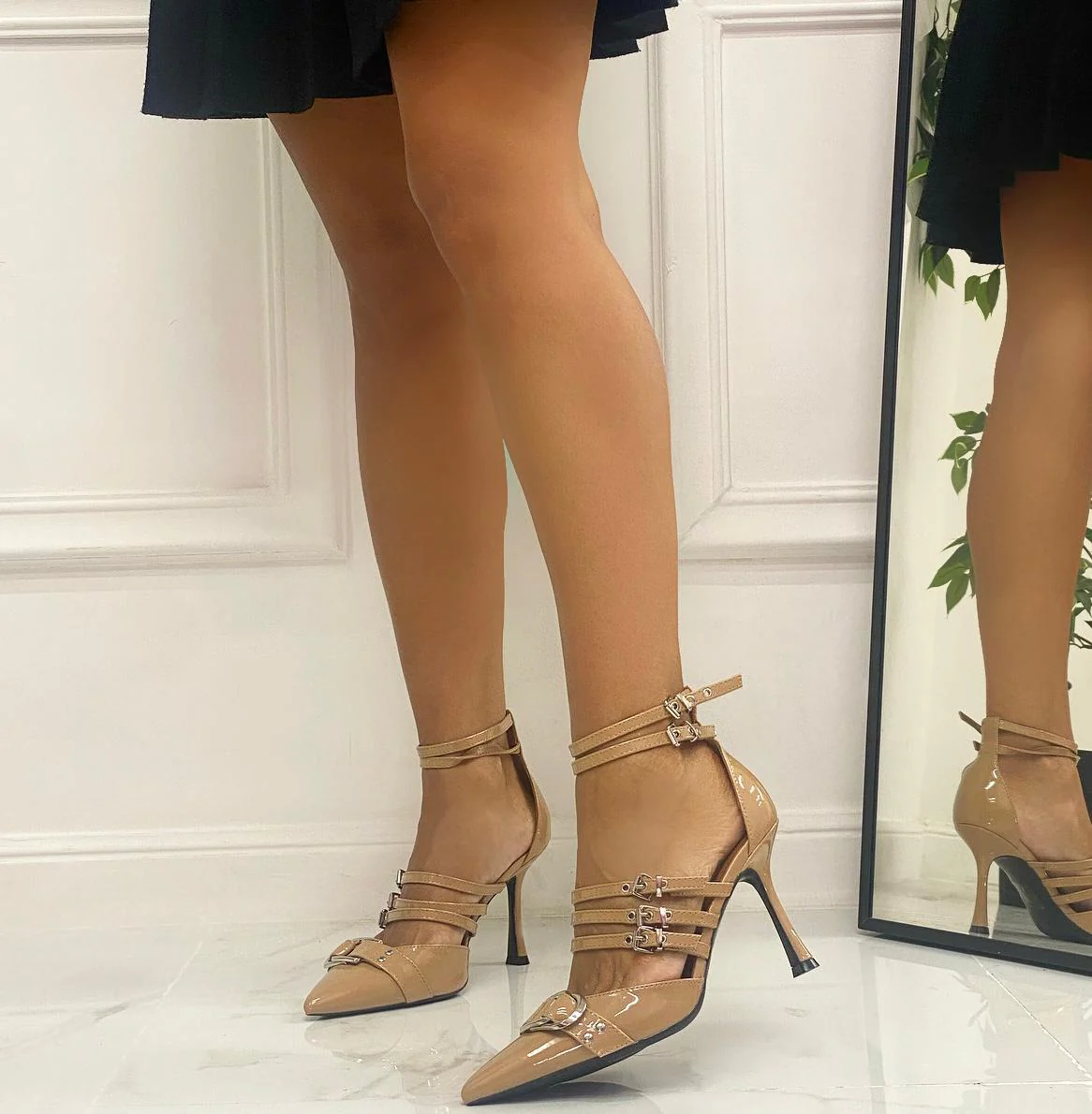 Angy – Décolleté Donna Scarpa Cinturini Tacco Spillo Vernice Elegante Beige