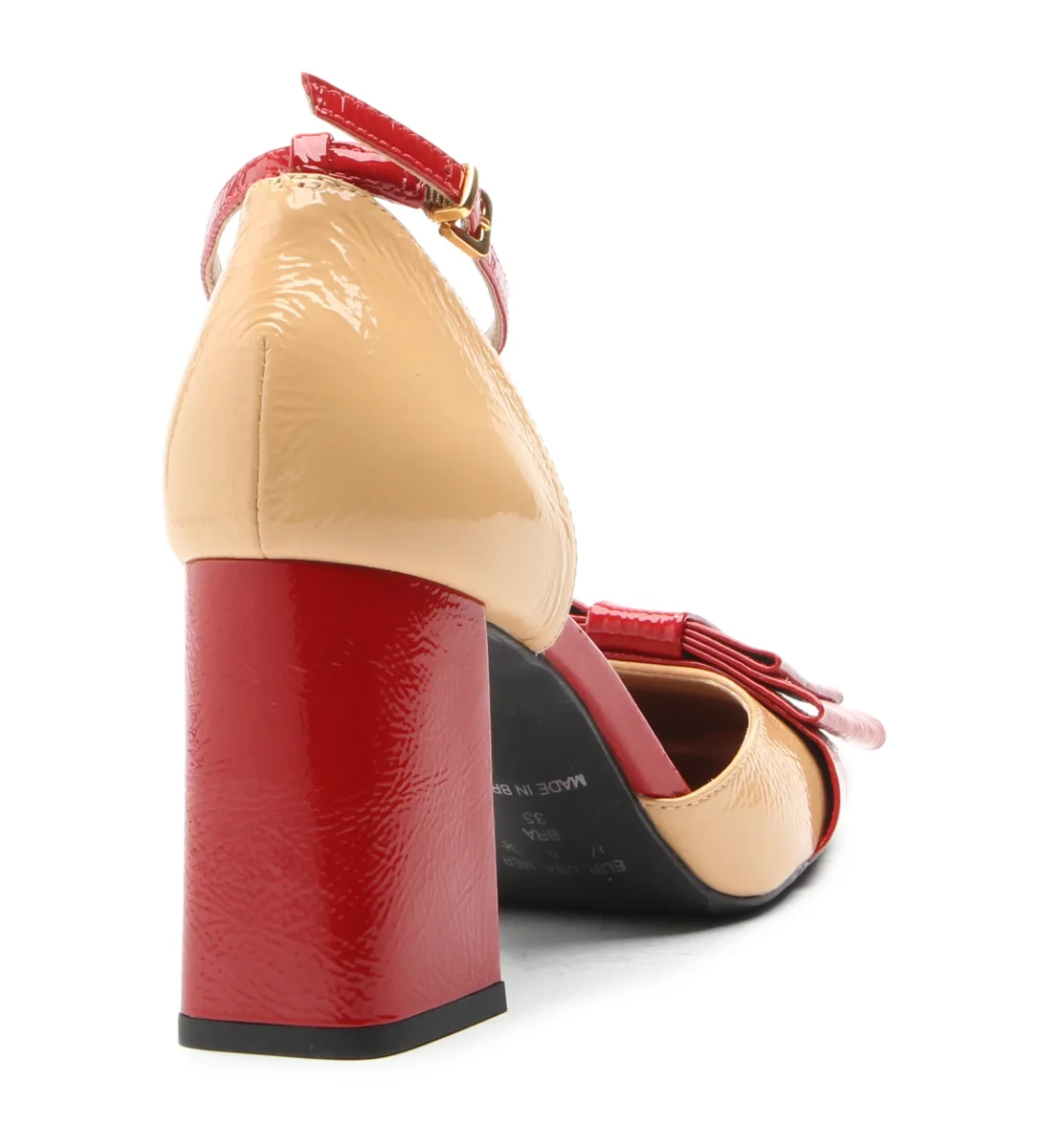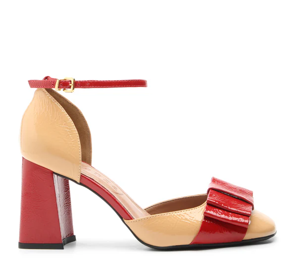 Il tacco รจ block e la suola gomma molto pratica. La combinazione di colore la rende ricercata, vernice beige con dettagli rossi.
