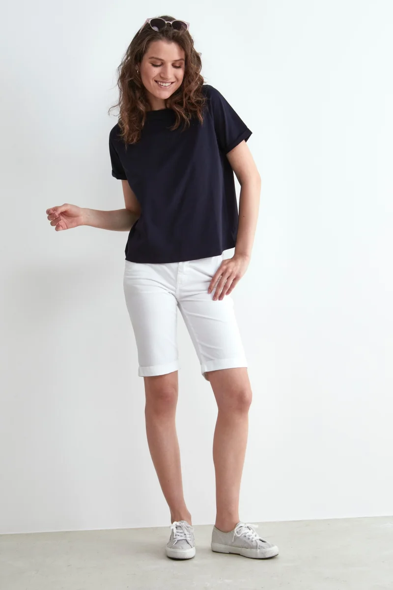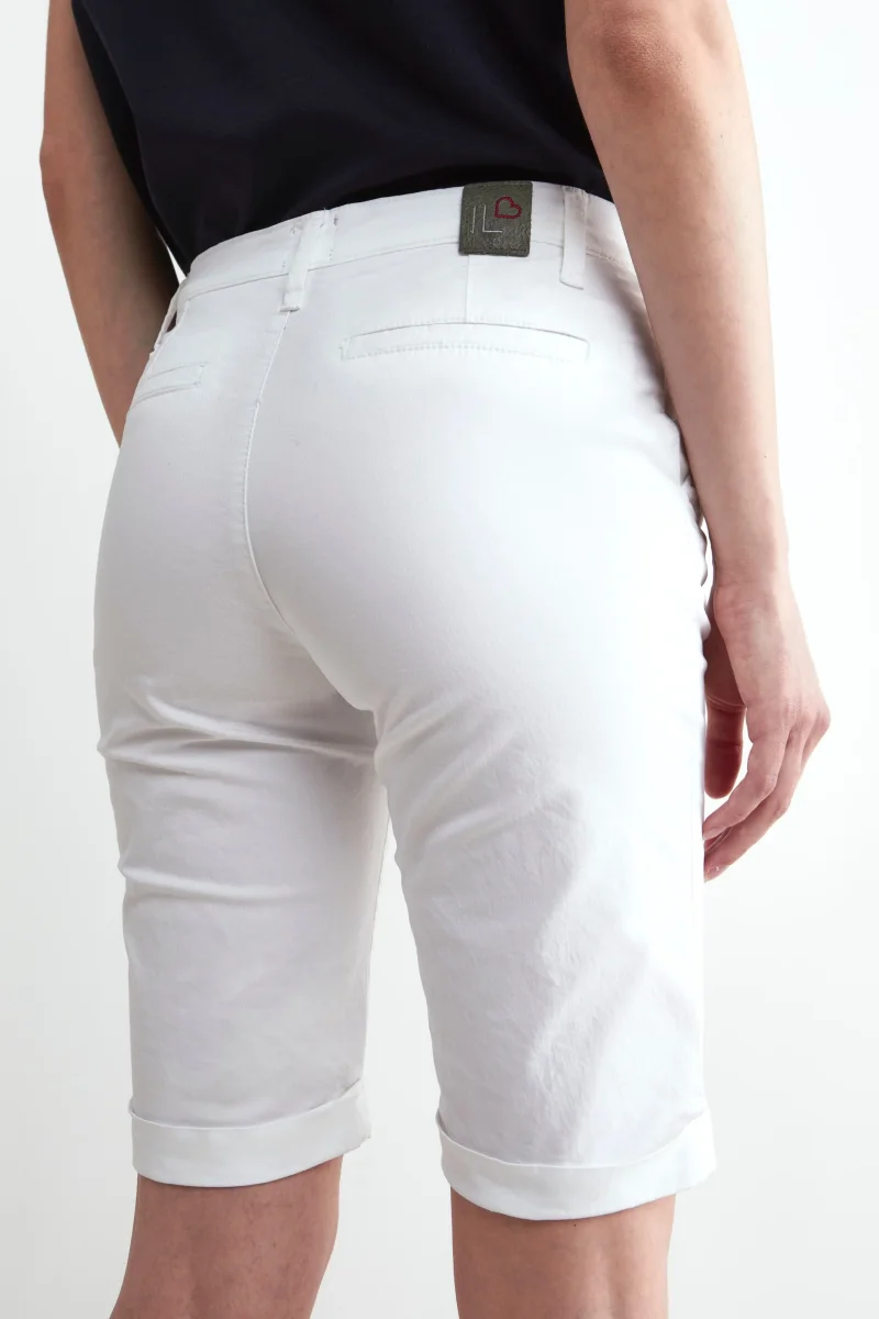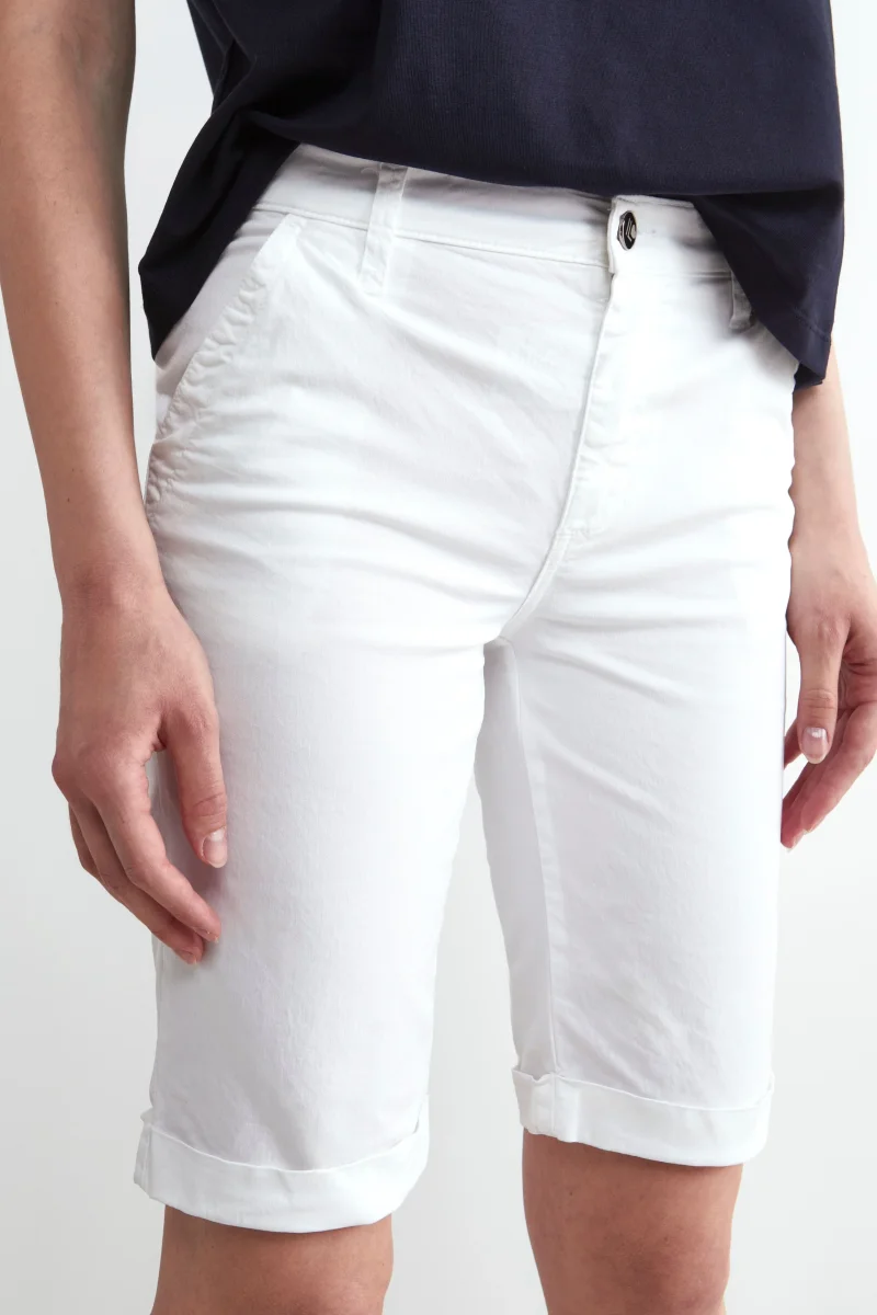 Bermuda in cotone bianco da donna, essenziale estivo per un abbigliamento femminile fresco e versatile Questo bermuda da donna aderente รจ realizzato in gabardina di cotone di alta qualitร , con vita bassa, risvolto al fondo, passanti per cintura e chiusura frontale con zip e bottone. Il taglio slim fit valorizza la silhouette, pur mantenendo una vestibilitร comoda (si consiglia una taglia in piรน per un fit piรน morbido). Perfetto per la stagione calda, รจ un capo chiave del guardaroba estivo nellโabbigliamento per donna, facile da abbinare con camicette leggere o t-shirt minimal per un look casual, rilassato ma sempre curato. Il colore bianco lo rende luminoso e facile da coordinare con ogni nuance. Made in Italy. La modella indossa la taglia 40.