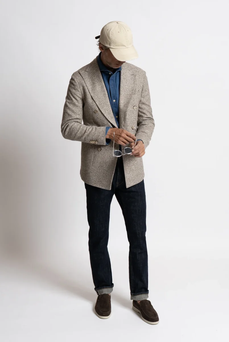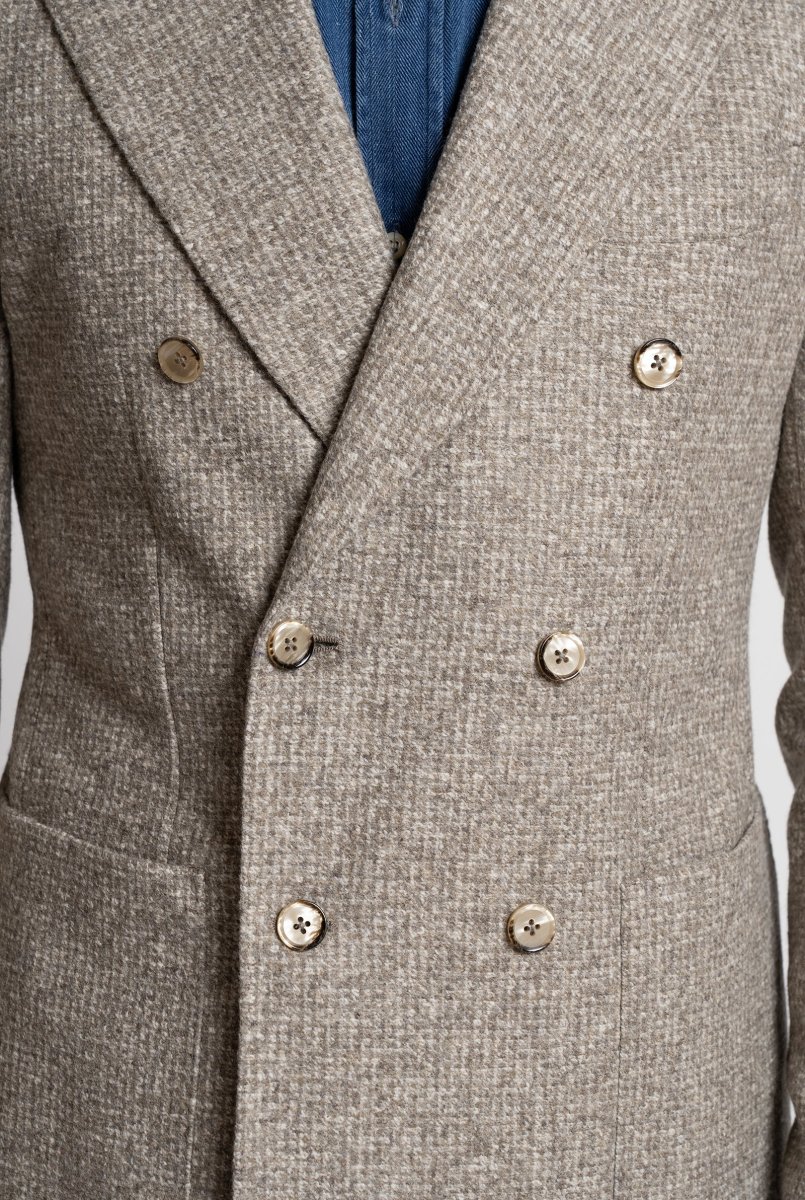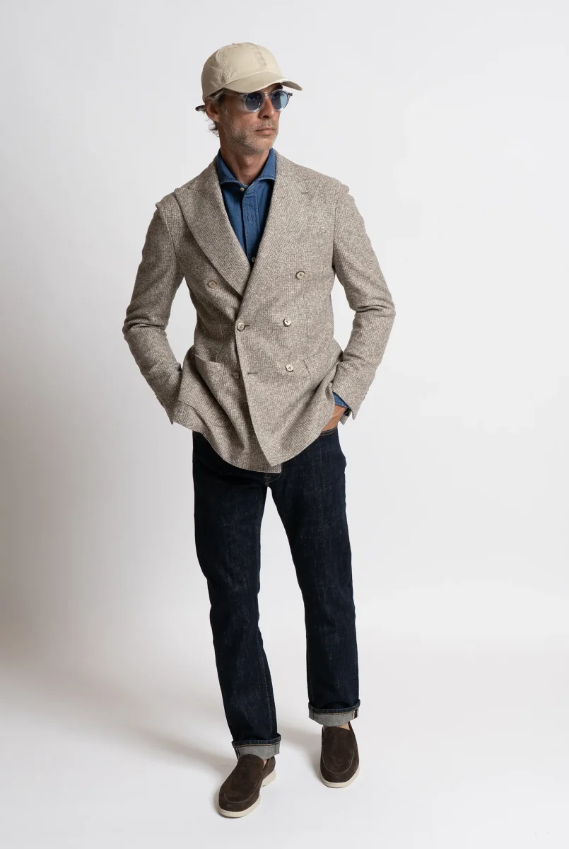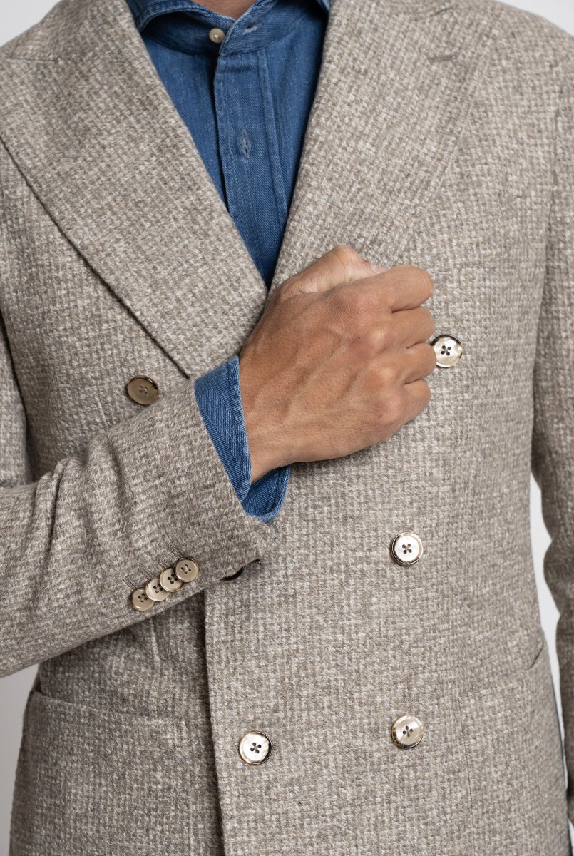 Giacca doppiopetto in lana. Realizzata con cura artigianale in Italia, รจ completamente sfoderata per garantire leggerezza e una vestibilitร regolare, ideale per un look raffinato e disinvolto.