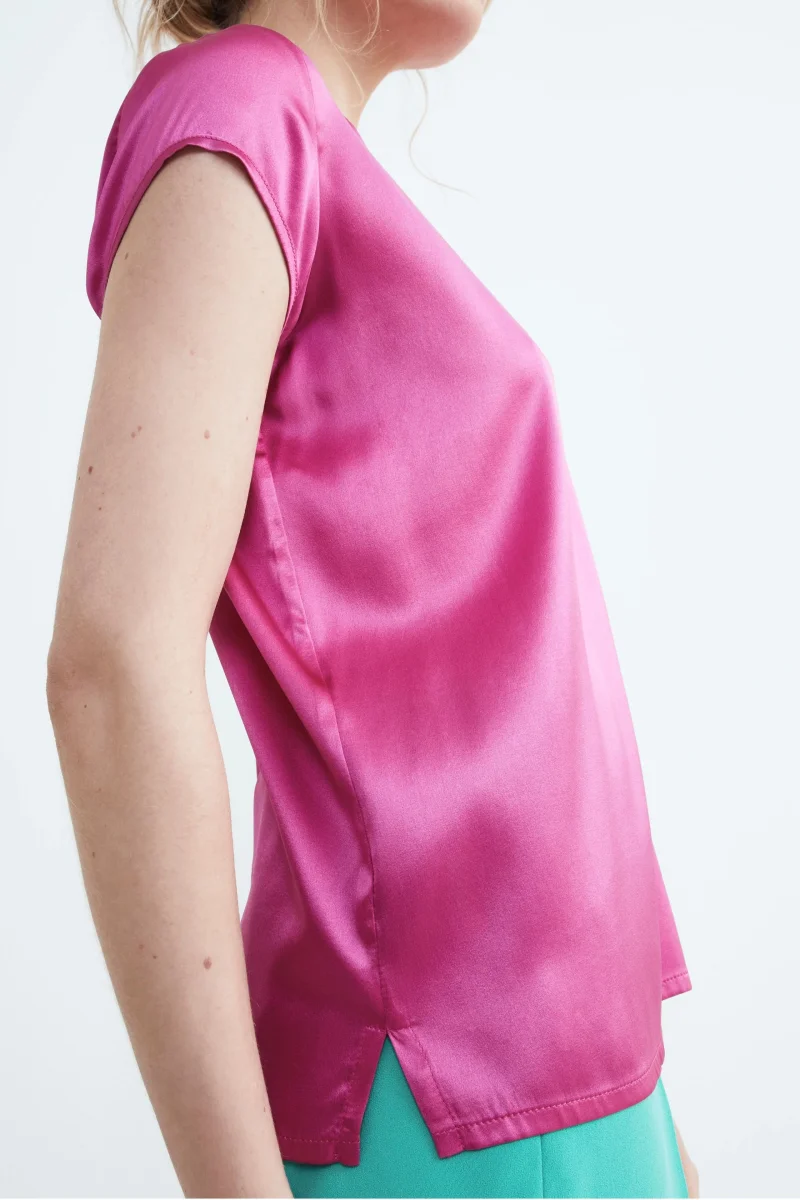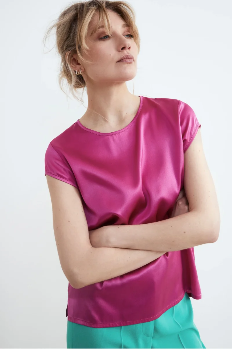 Blusa girocollo in seta caratterizzata da manica ad aletta e vestibilitร fluida. Un capo prezioso da indossare sia nei look business che nelle occasioni formali. La modella รจ alta 175 cm e indossa la taglia 40.
