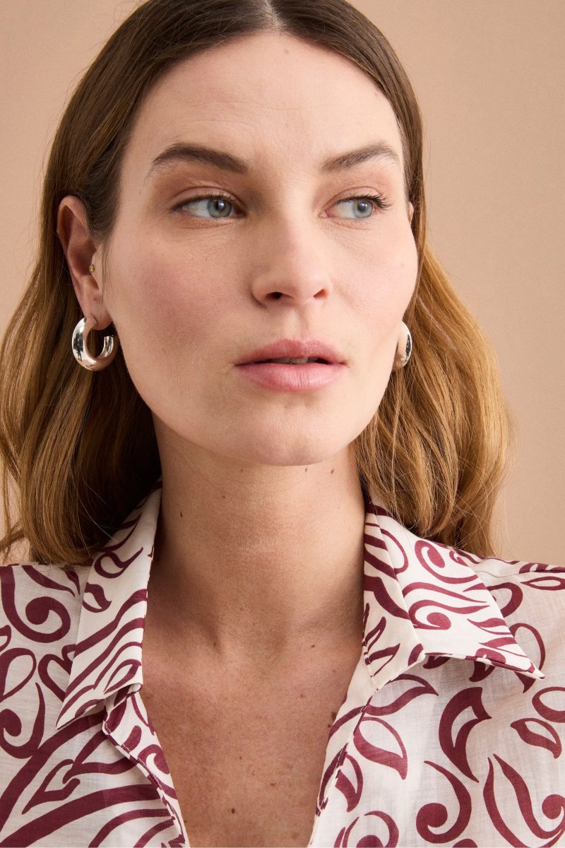 Blusa over in fantasia jacquard con scollo a V, un capo femminile e versatile, pensato per valorizzare la silhouette con una linea morbida e contemporanea. Realizzata in tessuto jacquard dalla texture ricercata, si distingue per la vestibilitร over che cade fluida sul busto, offrendo comfort e movimento, mentre lo scollo a V slancia la figura con eleganza. Le maniche lunghe completano il design con equilibrio, rendendo questa blusa ideale per la mezza stagione e perfetta sia per look quotidiani sia per occasioni piรน raffinate. Parte della collezione Il Lanificio e interamente Made in Italy, si abbina con naturalezza a pantaloni sartoriali o gonne midi per un outfit sofisticato, oppure a denim e blazer per uno stile casual chic dal carattere contemporaneo. La modella รจ alta 178 cm e indossa la taglia 42.