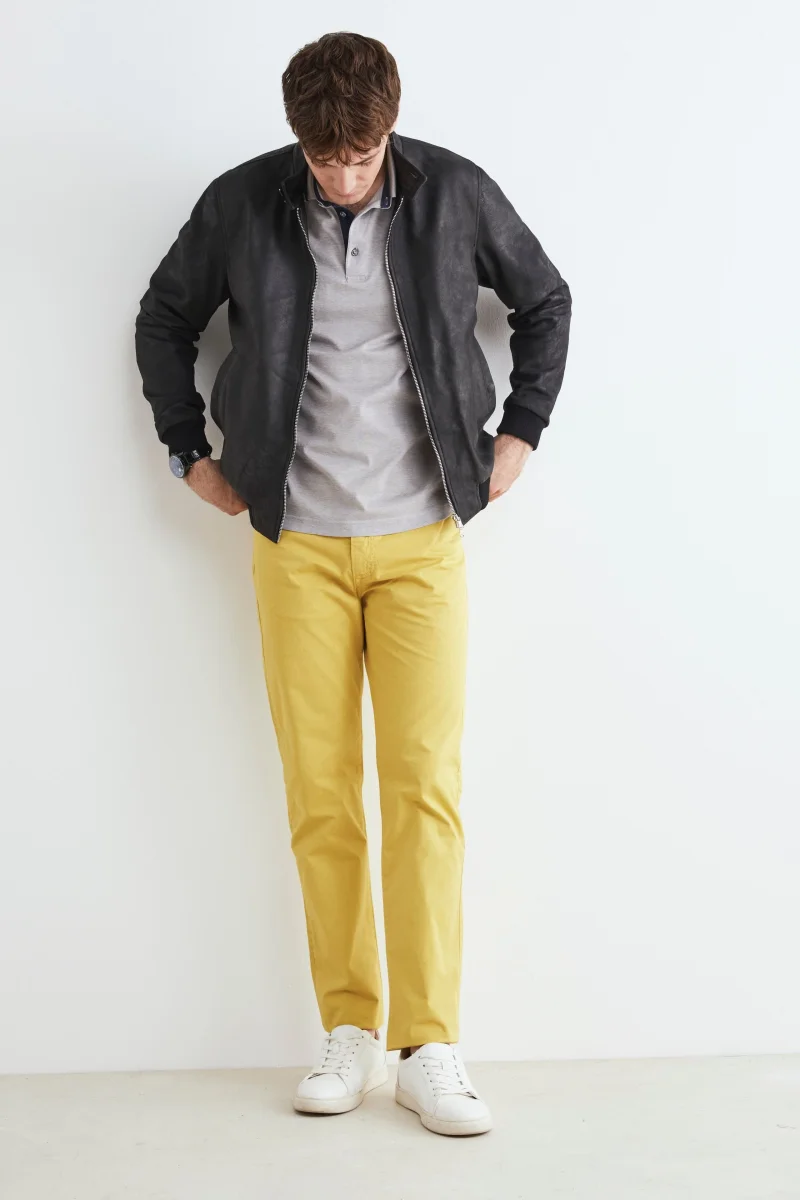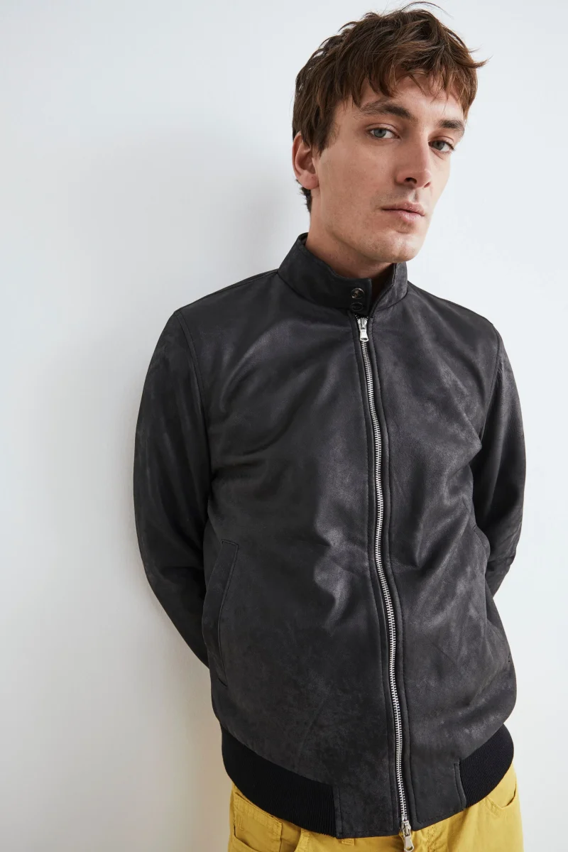 Giacca di pelle da uomo con collo alla coreana, chiusura a zip frontale e pratiche tasche. Vestibilitร regolare. Realizzato con pelle di alta qualitร , questo capo iconico aggiunge un tocco di raffinatezza ad ogni outfit. Con la sua silhouette classica e la lavorazione artigianale impeccabile, il nostro bomber offre un mix perfetto di comfort e […]