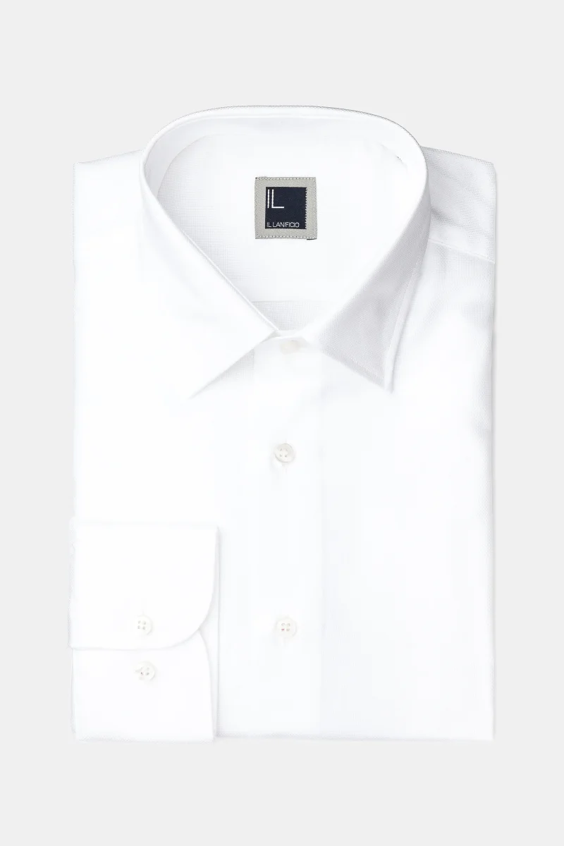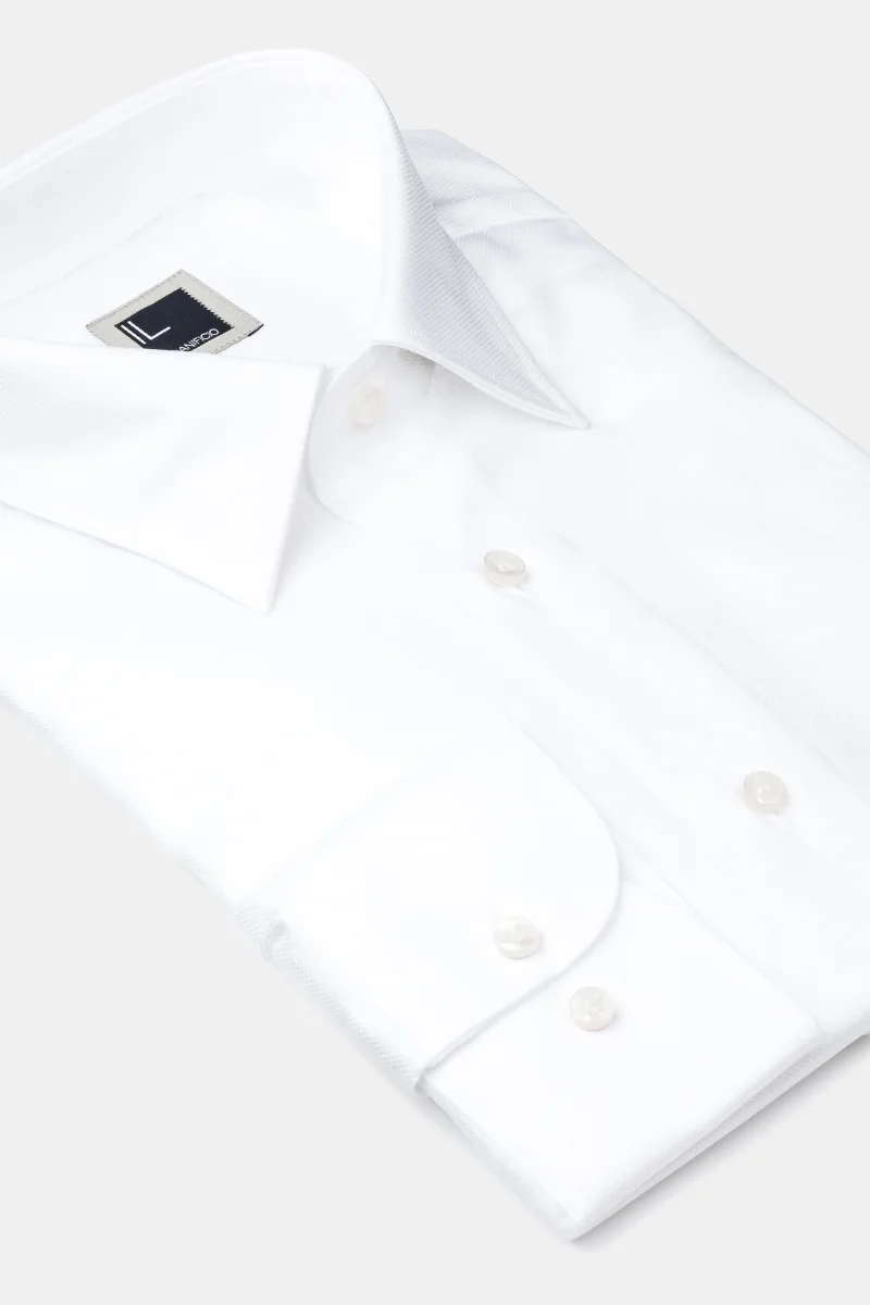 Camicia in cotone tinto in filo armaturato giro inglese, collo classico italiano vestibilità regolare. Le stecche estraibili, l’attaccatura delle maniche all’inglese, i bottoni cuciti con punto annodato per una perfetta tenuta, le cuciture con 7 punti al cm danno alle nostre camicie quel tocco sartoriale in più che le rendono uniche.