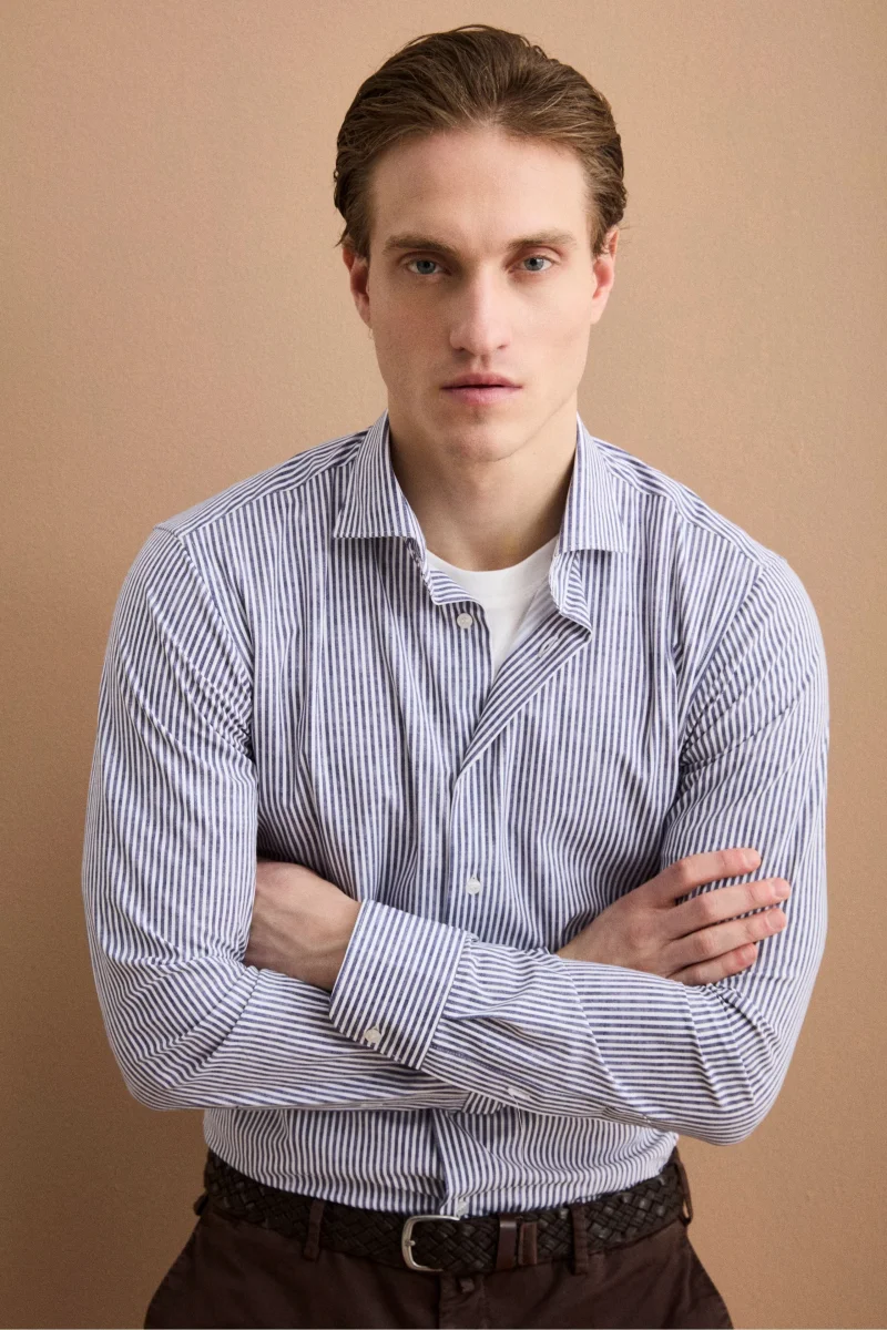 Camicia Custom Fit a Righe in Tessuto Tecnico – BLU RIGATO
