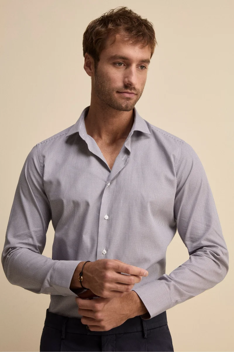 Camicia Fantasia Slim Fit Collo Francese, realizzata in 100% cotone per una sensazione di freschezza e comfort. Caratterizzata da un collo francese che aggiunge un tocco di raffinatezza, questa camicia da uomo presenta una fantasia pied de poule che le conferisce un design classico e moderno al contempo. La vestibilitร slim offre una linea aderente e slanciata, mentre le pinces posteriori garantiscono una silhouette impeccabile. Perfetta per essere indossata con abiti eleganti o in occasioni piรน casual, la Camicia Fantasia Slim Fit Collo Francese รจ ideale per lโuomo che desidera uno stile sofisticato ma pratico. Abbinala a jeans o pantaloni sartoriali per un look sempre raffinato e contemporaneo. Il modello รจ alto 189 cm e indossa la taglia 50.