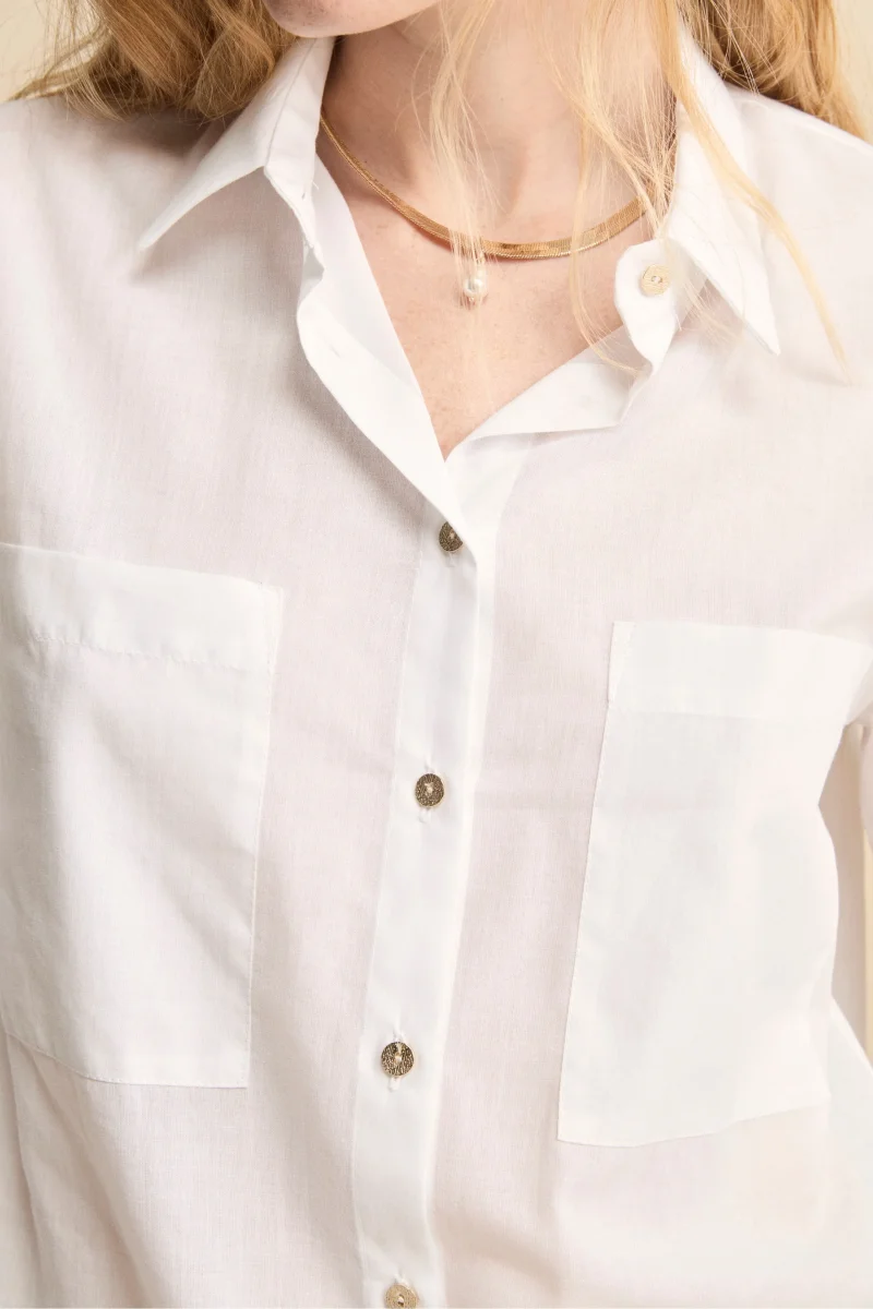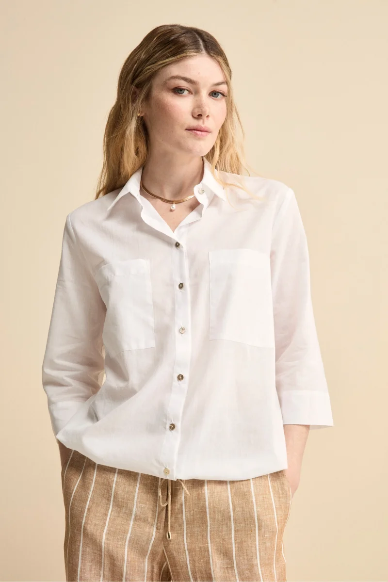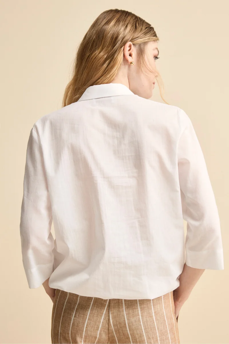Camicia Over in Cotone con Coulisse, un capo essenziale per il guardaroba di ogni donna moderna. Dal design fresco e contemporaneo, questa camicia over da donna รจ realizzata in 100% mussola di cotone, un tessuto leggerissimo e traspirante perfetto per la stagione primavera estate. Il modello presenta un colletto classico, una chiusura frontale con bottoni, maniche 3/4 e due taschini applicati sul petto che aggiungono un tocco casual e funzionale. Il fondo con coulisse regolabile consente di personalizzare la vestibilitร , rendendola ideale sia per uno stile rilassato che piรน strutturato. Parte della collezione IL Lanificio, questa camicia in cotone da donna si abbina perfettamente a pantaloni in lino o jeans chiari per un look casual chic da giorno, oppure sopra una gonna midi per un tocco piรน raffinato. Made in Italy. La modella รจ alta 170 cm e indossa la taglia 42.