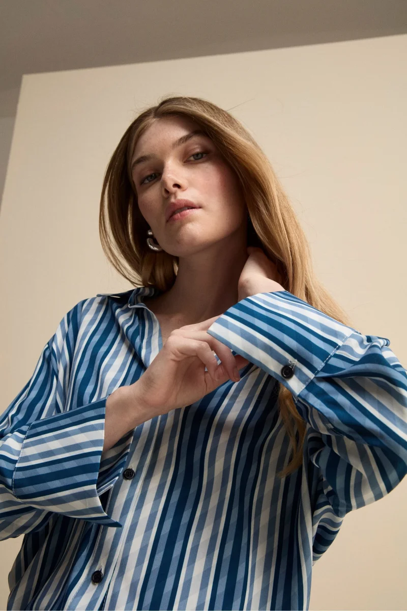 Camicia Over con Scollo a V, realizzata in morbida viscosa per garantire una sensazione di leggerezza e comfort. Caratterizzata da un elegante colletto morbido aperto e da una raffinata fantasia a righe, questa camicia da donna presenta una pratica chiusura frontale con bottoni. La vestibilitร oversize e il design contemporaneo la rendono perfetta per abbinamenti versatili, sia con pantaloni sartoriali per un look sofisticato, sia con jeans per uno stile piรน casual e rilassato. Parte della collezione esclusiva IL Lanificio, questa camicia racchiude tutta la qualitร e lโeleganza del Made in Italy, ideale per chi ama distinguersi con capi di classe e sempre attuali. La modella รจ alta 170 cm e indossa la taglia 42.