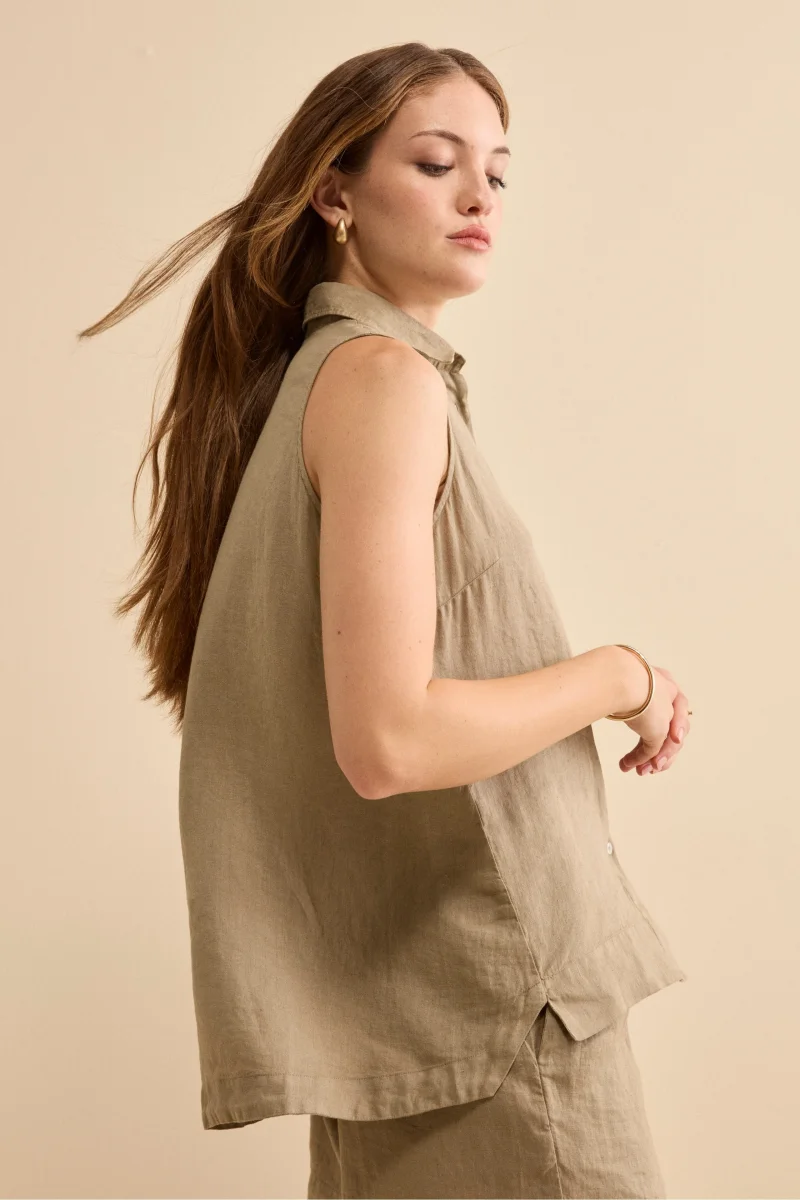 Leggera ed elegante, questa Camicia Over Smanicata in Lino รจ un capo essenziale per il guardaroba estivo femminile. Realizzata in 100% lino tinto capo con lavorazione finta inglese, unisce la naturalezza del lino a una texture raffinata e leggermente strutturata, ispirata alla tradizione sartoriale britannica. Il design over presenta linee morbide, colletto classico, chiusura frontale con bottoni e spacchetti laterali, mentre il taglio piรน lungo sul retro dona movimento e armonia alla silhouette. La vestibilitร fluida e senza maniche la rende perfetta per affrontare le giornate piรน calde con uno stile rilassato ma ricercato. Parte della collezione IL Lanificio, questa camicia in lino da donna รจ ideale da abbinare a un pantalone in lino con coulisse, una gonna midi fluida o un denim chiaro per un look estivo elegante, da cittร o da vacanza. Made in Italy. La modella รจ alta 175 cm e indossa la taglia 42.
