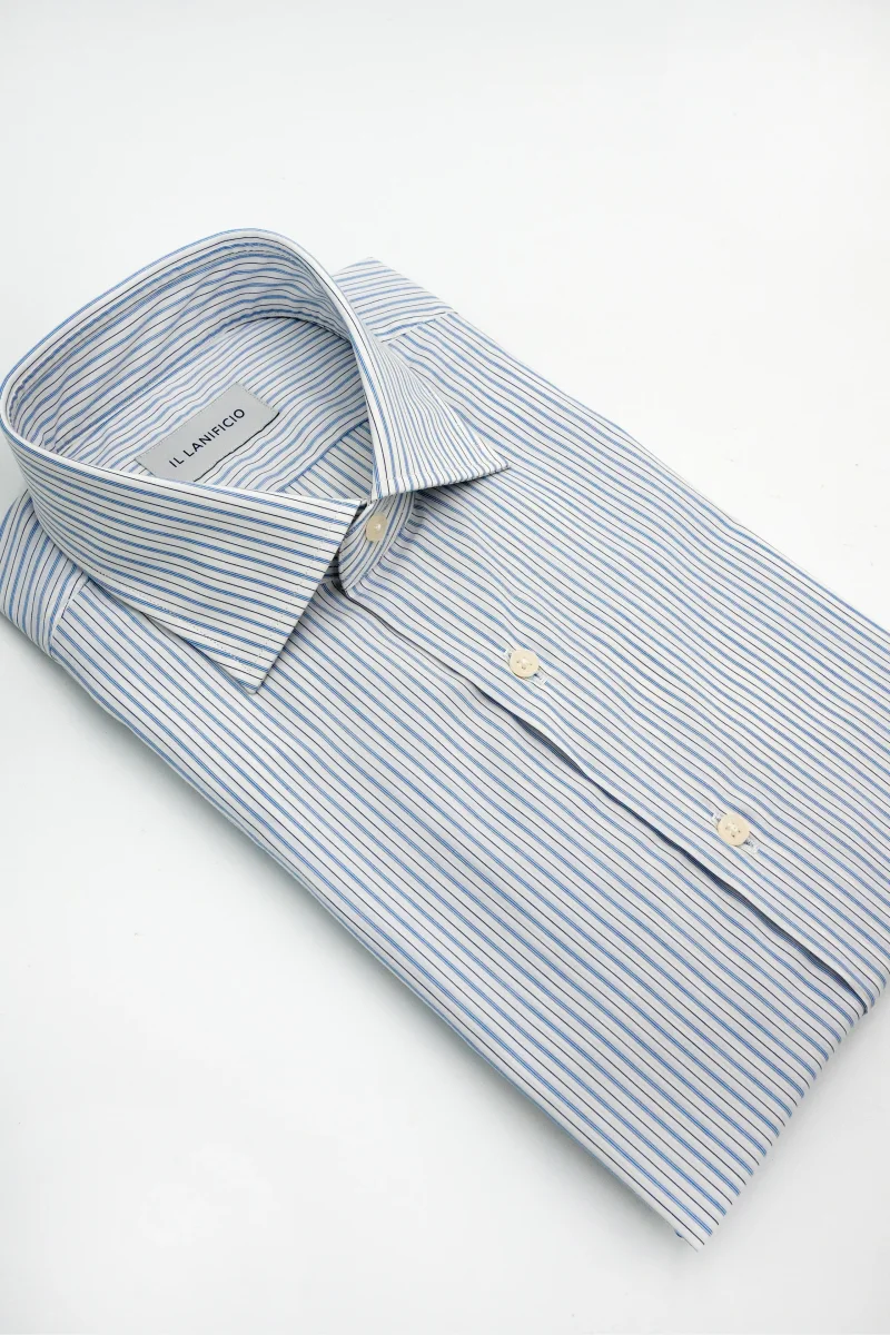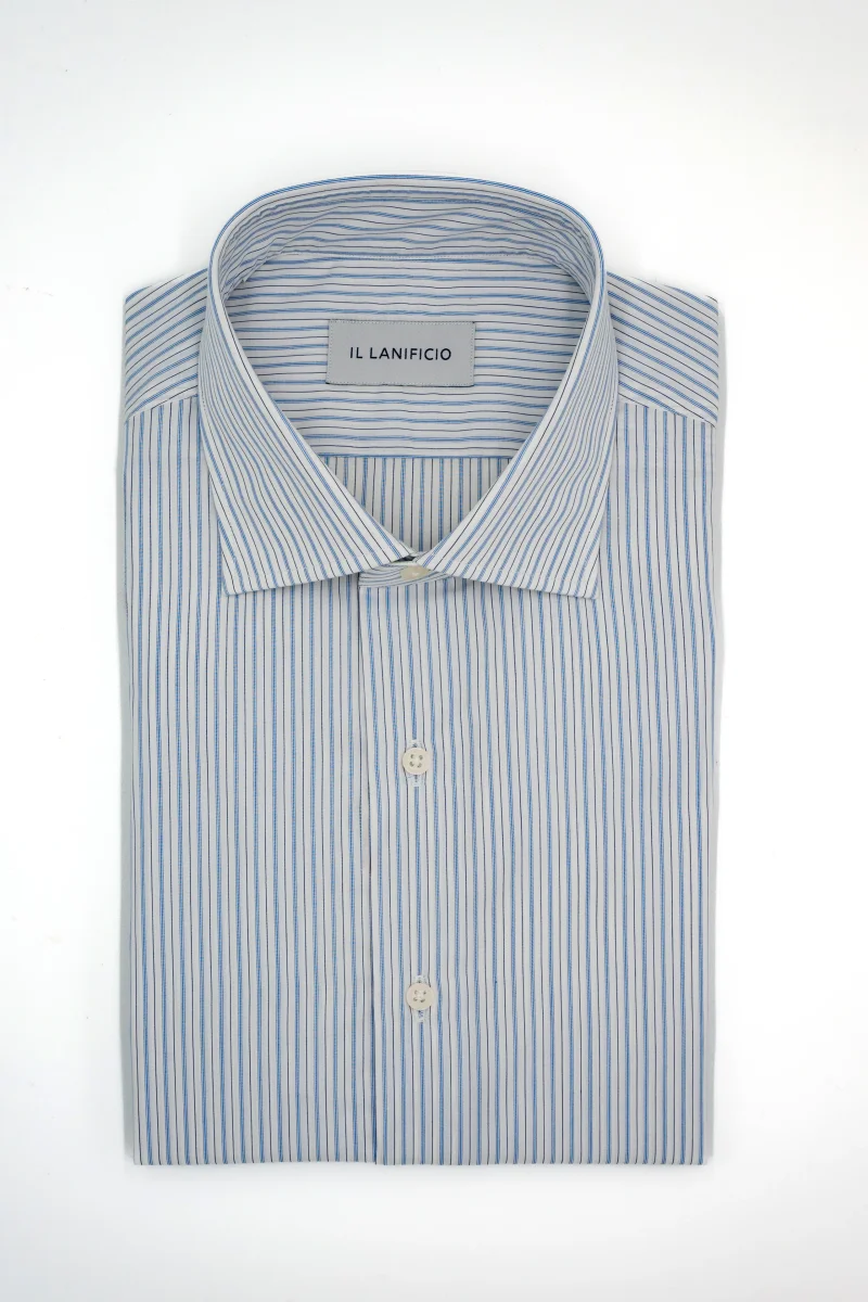 Camicia Regular Fit a Righe, un capo raffinato e versatile, realizzato in 100% cotone di alta qualitร con righe azzurro-blu che slanciano la figura e donano personalitร allโoutfit. La vestibilitร regolare offre un perfetto equilibrio tra comfort e aderenza, mentre il collo mezzo francese e il polso tondo conferiscono unโeleganza contemporanea. Parte della collezione uomo Il Lanificio, questa camicia a righe si distingue per lo stile curato nei dettagli e la capacitร di adattarsi a diverse occasioni, dal lavoro al tempo libero. Perfetta con un abito in lana blu o grigio antracite per un look professionale impeccabile, mantiene la sua raffinatezza se abbinata a pantaloni chino beige e blazer sartoriale per unโeleganza rilassata, oppure a jeans slim scuri con mocassini in pelle per un outfit casual dallโallure moderna. Una camicia da uomo che unisce tradizione e innovazione, ideale per chi cerca un capo versatile, elegante e sempre attuale.