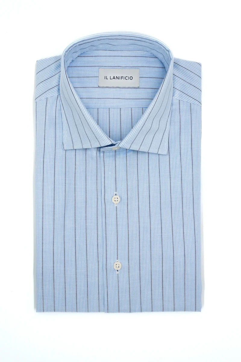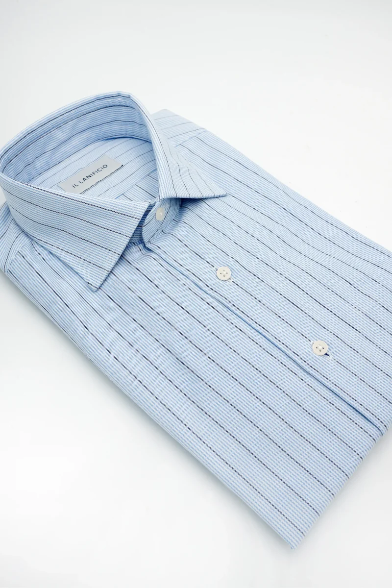 Camicia Regular Fit in Fantasia, realizzata in 100% cotone con una raffinata fantasia a righe azzurro-blu, รจ la scelta ideale per chi desidera un capo elegante ma versatile. La vestibilitร regular fit assicura comfort e libertร di movimento, mentre il colletto mezzo francese e il polso tondo conferiscono un tocco moderno e ricercato. Parte della collezione uomo Il Lanificio, questa camicia da uomo in fantasia รจ pensata per interpretare con stile sia lโambito professionale che il tempo libero. Perfetta sotto un abito sartoriale blu o grigio chiaro per un look formale di carattere, trova la sua naturale espressione anche con pantaloni chino beige e blazer in cotone per unโeleganza disinvolta, oppure con jeans dritti scuri e mocassini in pelle per un outfit smart casual dal fascino contemporaneo. Un capo senza tempo che unisce praticitร e raffinatezza, immancabile nel guardaroba maschile.