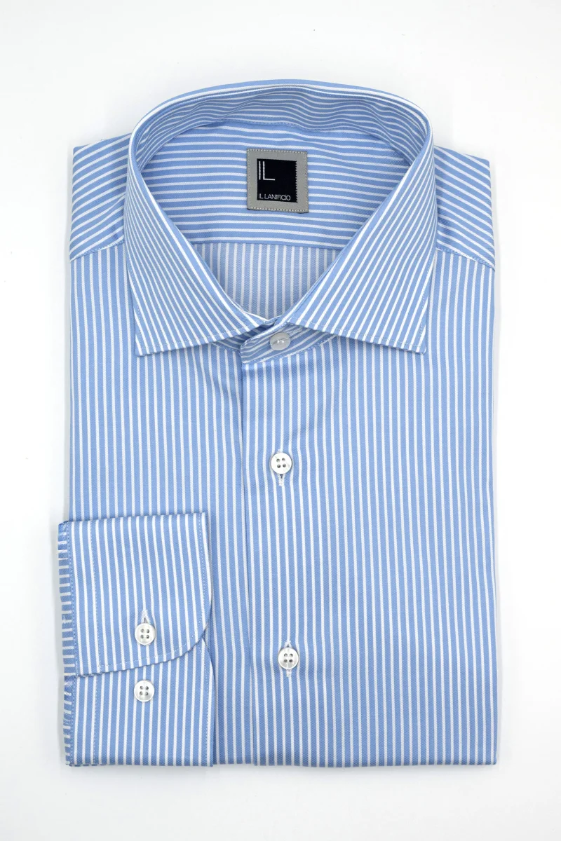 Realizzata in 100% cotone con fantasia a righe bianco e azzurre, questa camicia slim fit da uomo unisce eleganza e vestibilitร definita. Il collo francese dona un tocco sofisticato e si presta perfettamente allโabbinamento con giacca e cravatta, mentre la chiusura frontale con bottoni completa un design essenziale e versatile. Parte della collezione IL Lanificio, รจ ideale con un completo formale per lโufficio o con pantaloni chino e blazer per un look business casual dal gusto contemporaneo.