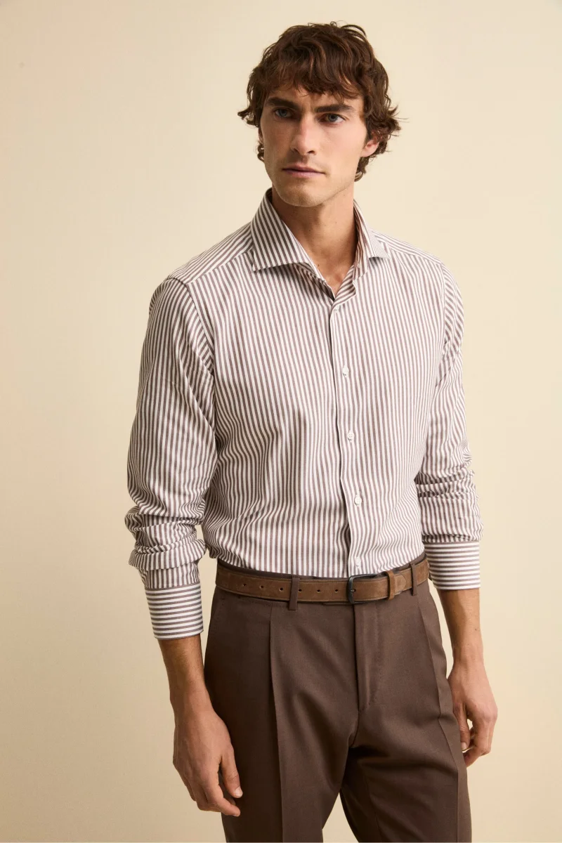 Camicia Slim Fit in Cotone con Collo Francese – MARRONE RIGATO