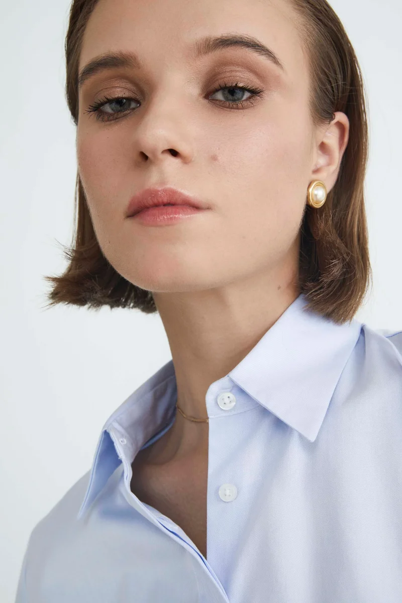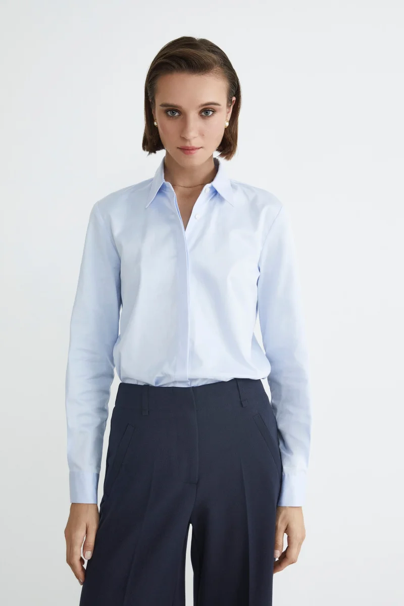 Camicia slim in cotone azzurro da donna, eleganza essenziale per look professionali e raffinati. Questa camicia da donna a maniche lunghe, realizzata in puro cotone, presenta una linea sciancrata che valorizza la silhouette con discrezione. Il colletto classico e la tonalitร azzurra la rendono una scelta impeccabile per chi desidera uno stile formale ma contemporaneo. Perfetta da indossare in ufficio, a una riunione o per unโoccasione formale, รจ il capo ideale per una donna dinamica che vuole sentirsi sicura e curata in ogni momento. Unโalternativa moderna e femminile ai tradizionali camici donna, questa camicia elegante si abbina perfettamente a pantaloni sartoriali o gonne midi, diventando un punto fermo nel guardaroba di chi cerca qualitร e stile. La modella รจ alta 179 cm e indossa la taglia 42.