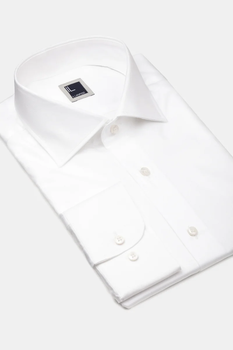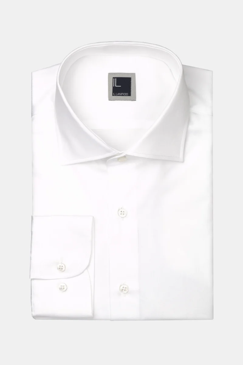 Questa camicia da uomo bianca รจ realizzata in cotone twill doppio ritorto 100/2, un tessuto pregiato che assicura una morbidezza superiore, ottima traspirabilitร e resistenza alla piega. Il design con collo francese e vestibilitร regolare la rende perfetta per completare con stile sia outfit business che look da cerimonia. Dettagli sartoriali come le stecche estraibili, le maniche con attaccatura allโinglese, i bottoni cuciti con punto annodato e le cuciture da 7 punti al cm confermano lโattenzione alla qualitร e allโeleganza distintiva de Il Lanificio. Un capo versatile ed essenziale nel guardaroba maschile, ideale da abbinare a un completo classico o a un blazer per un abbigliamento formale impeccabile.