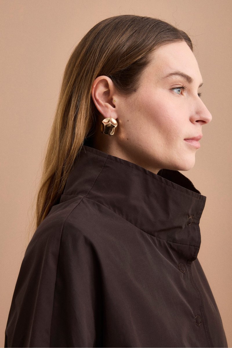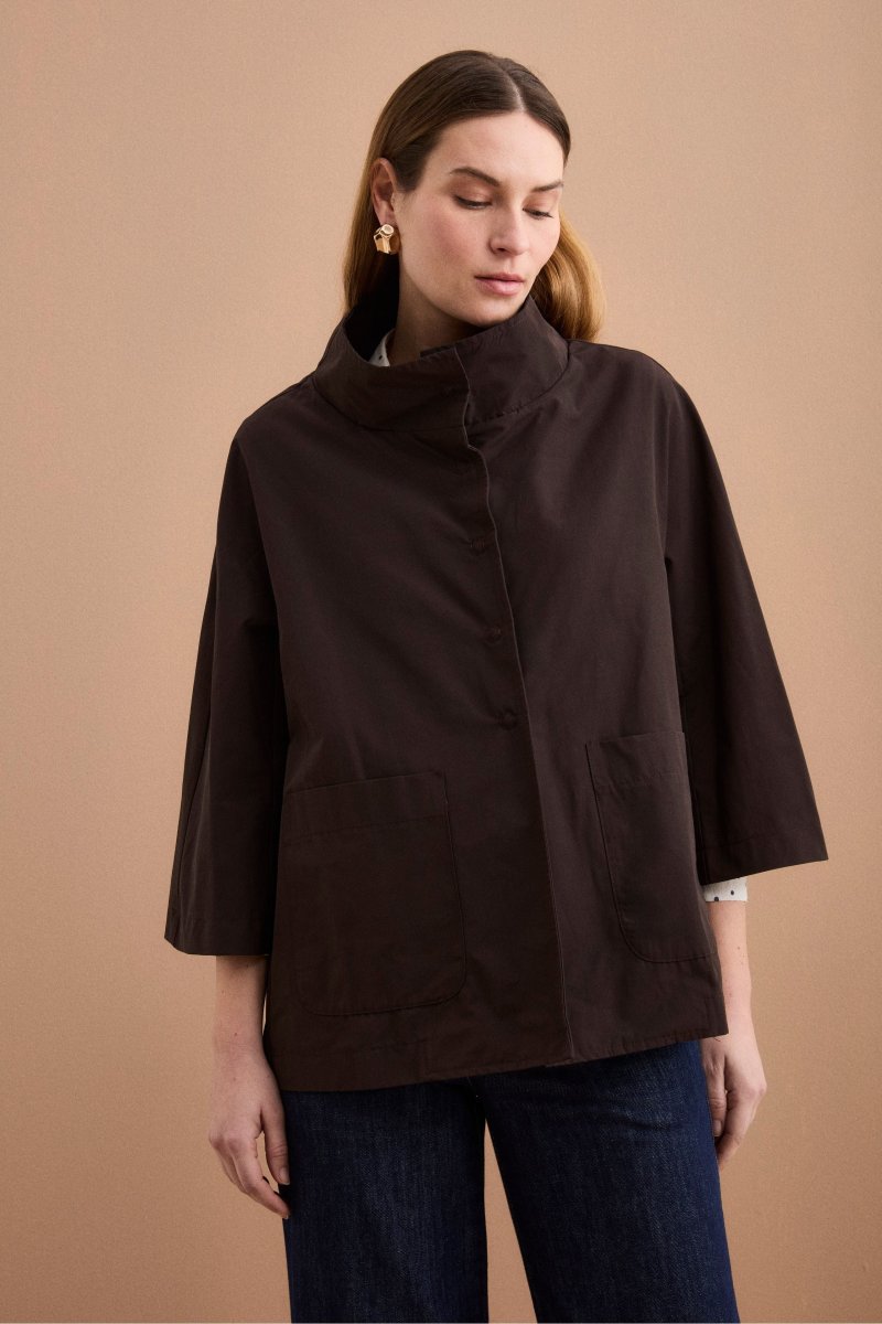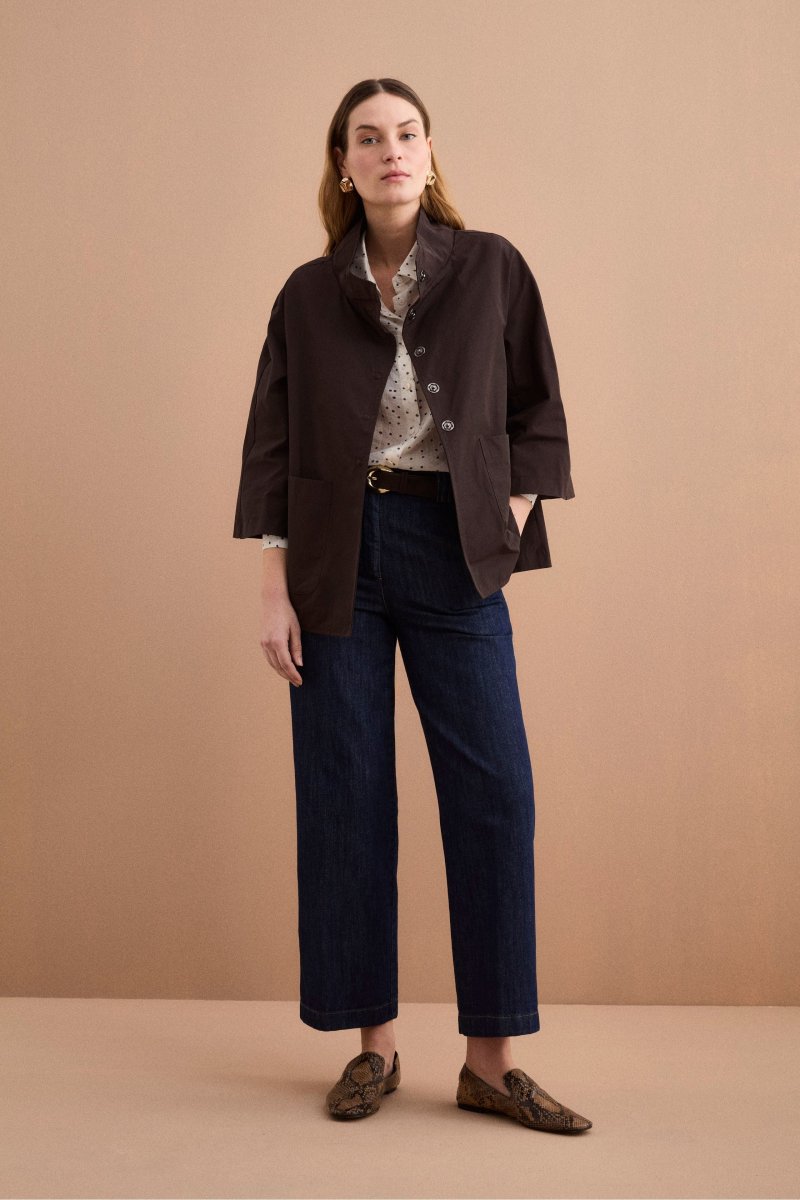 Cappa over sfoderata in misto cotone, una giacca da donna dal design contemporaneo, ideale per la mezza stagione grazie alla sua struttura leggera e versatile. Realizzata in misto cotone, presenta una linea ampia e svasata con lunghezza ai fianchi che dona movimento e comfort, mentre il colletto alto e la chiusura frontale con bottoni a pressione definiscono uno stile essenziale e raffinato. Le maniche ampie 3/4 e le tasche frontali applicate completano il modello con un equilibrio tra funzionalitร , valorizzando la silhouette con proporzioni moderne. Sfoderata per una vestibilitร piรน fluida, questa cappa รจ parte della collezione Il Lanificio ed รจ interamente Made in Italy. Perfetta da abbinare a pantaloni a palazzo o denim a gamba dritta per un look urbano sofisticato, oppure sopra abiti leggeri per uno stile femminile e disinvolto. La modella รจ alta 178 cm e indossa la taglia 44.