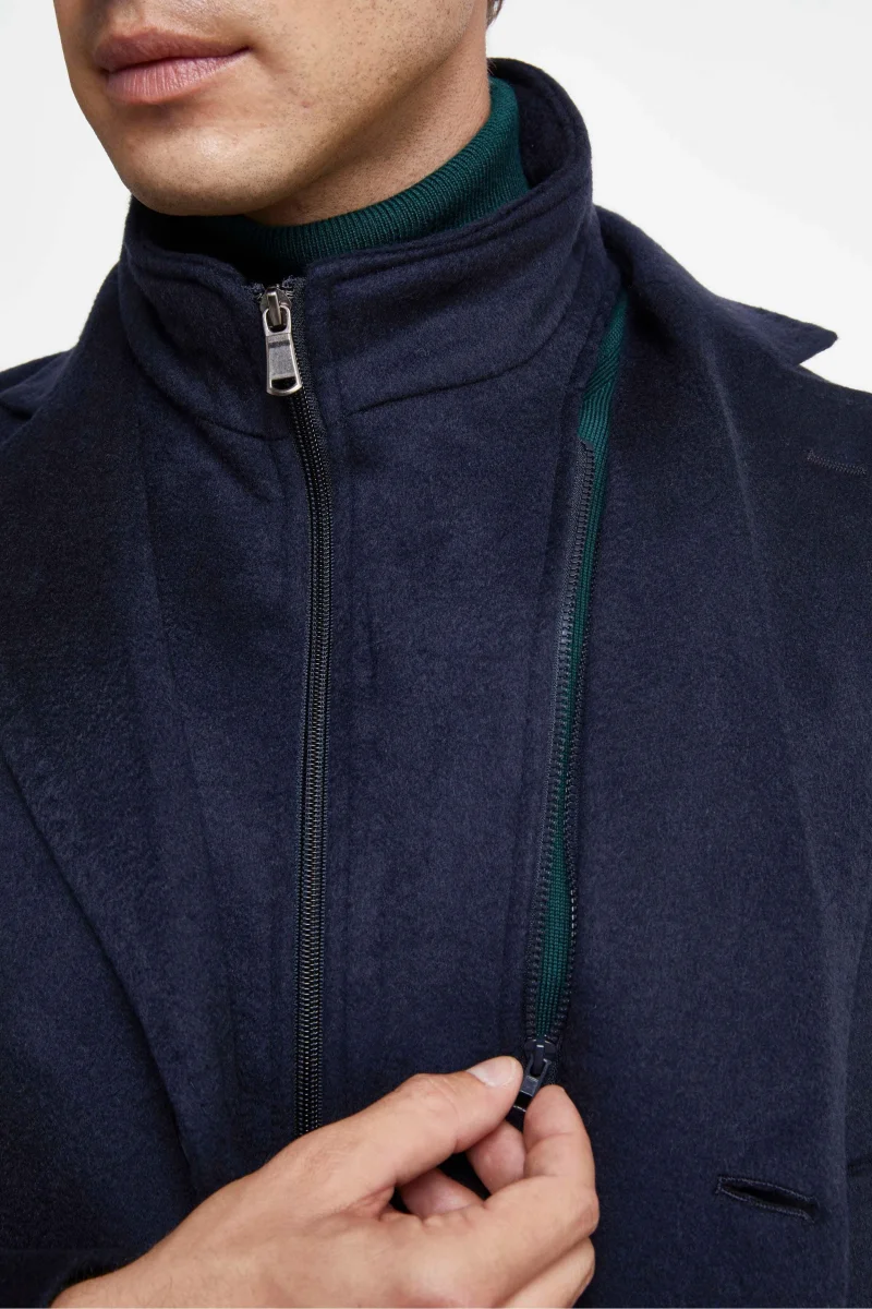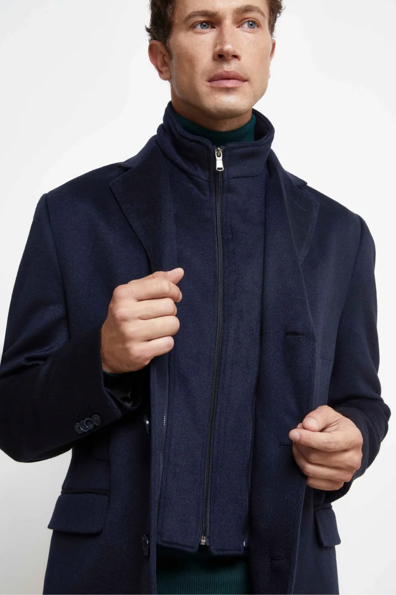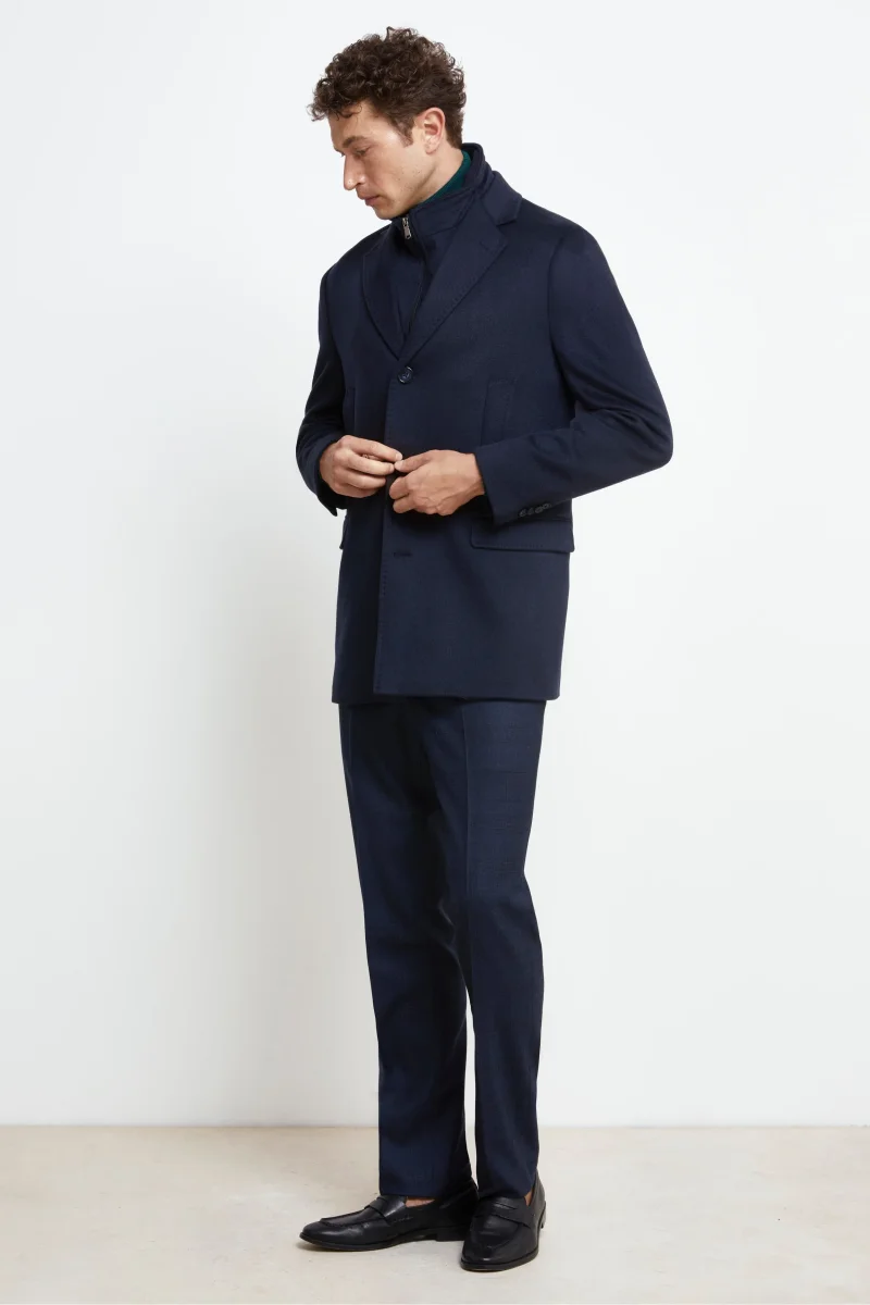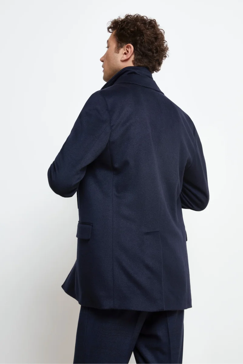 Riscopri il piacere del lusso con il nostro cappotto corto blu da uomo, realizzato con il pregiato tessuto del Lanificio F.lli Cerruti dal 1881. Questo capo esclusivo combina lana e cashmere per offrire calore e morbidezza incomparabili. Caratterizzato da un revers classico con paramontura in tessuto staccabile, ti permette di variare il tuo stile secondo lโoccasione. La chiusura con tre bottoni frontali, le tasche a pattina frontali e laterali, e lโelegante spacco singolo posteriore, conferiscono un tocco di eleganza classica e funzionale. Completamente foderato e prodotto interamente in Italia, questo cappotto rappresenta lโessenza della sartorialitร italiana, perfetto per lโuomo moderno che cerca stile senza tempo e qualitร superiore. Il modello รจ alto 189 cm e indossa la taglia 50.