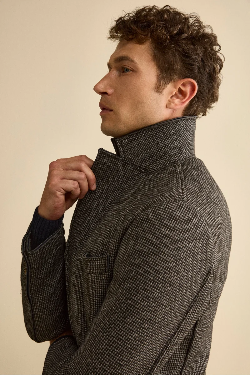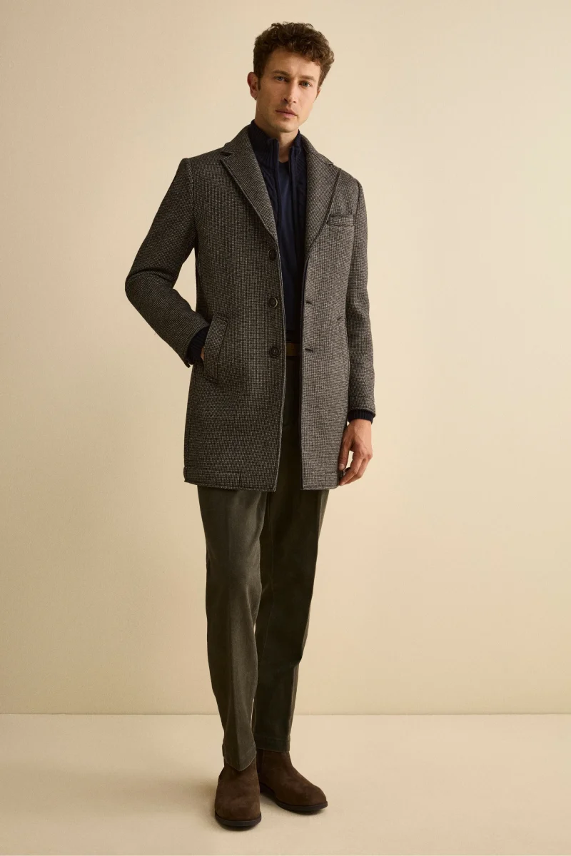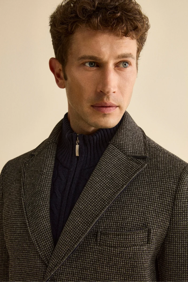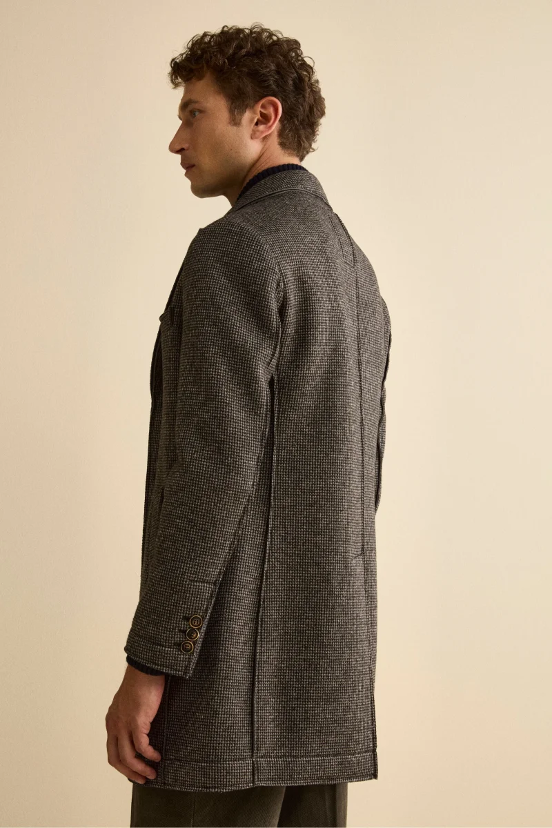 Cappotto Fantasia Midi a Taglio Vivo โ€“ Realizzato con lavorazione a taglio vivo, รจ un cappotto da uomo dalla linea midi che unisce eleganza e stile contemporaneo. Il modello presenta revers classico, chiusura frontale con tre bottoni, taschino a taglio sul cuore e tasche laterali a filo. La fodera รจ presente solo nella manica per una vestibilitร  leggera e confortevole, mentre la fantasia pied de poule aggiunge un tocco ricercato al design. Il fit regolare e la lunghezza midi lo rendono versatile e adatto sia a look formali che casual chic. Parte della collezione Il Lanificio, questo cappotto Made in Italy puรฒ essere abbinato a completi sartoriali per lโ€™ufficio oppure a maglioni e pantaloni in lana per un outfit elegante da tempo libero. Il modello รจ alto 189 cm e indossa la taglia 50.