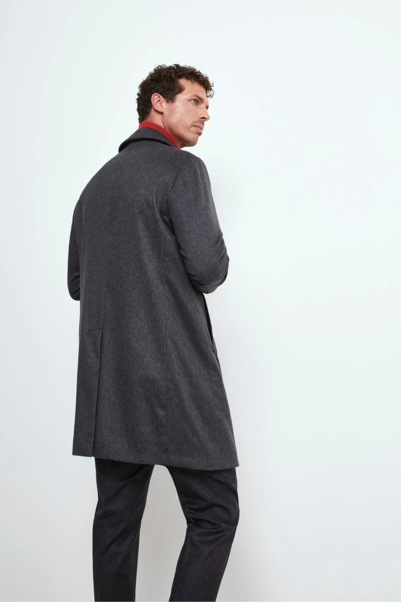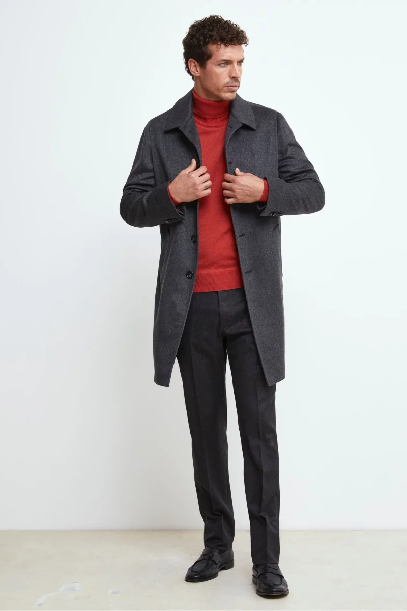 Cappotto grigio 100% cashmere, il capo ideale per affrontare lโ€™inverno con eleganza e calore. Realizzato con il prestigioso tessuto del Lanificio F.lli Cerruti dal 1881 e interamente foderato, questo cappotto รจ perfetto per le stagioni piรน fredde, offrendo unโ€™eccezionale combinazione di stile e funzionalitร . Caratterizzato da un colletto chiuso e tasche a pattina laterali, offre una vestibilitร  regolare che si estende fino alla coscia, garantendo uno stile sofisticato e senza tempo. La chiusura anteriore con bottoni e lo spacco singolo posteriore assicurano comfort e libertร  di movimento, mentre i cinturini ai polsi e il taschino a taglio sul petto completano il design con dettagli raffinati. Made in Italy. Il modello รจ alto 189 cm e indossa la taglia 50.