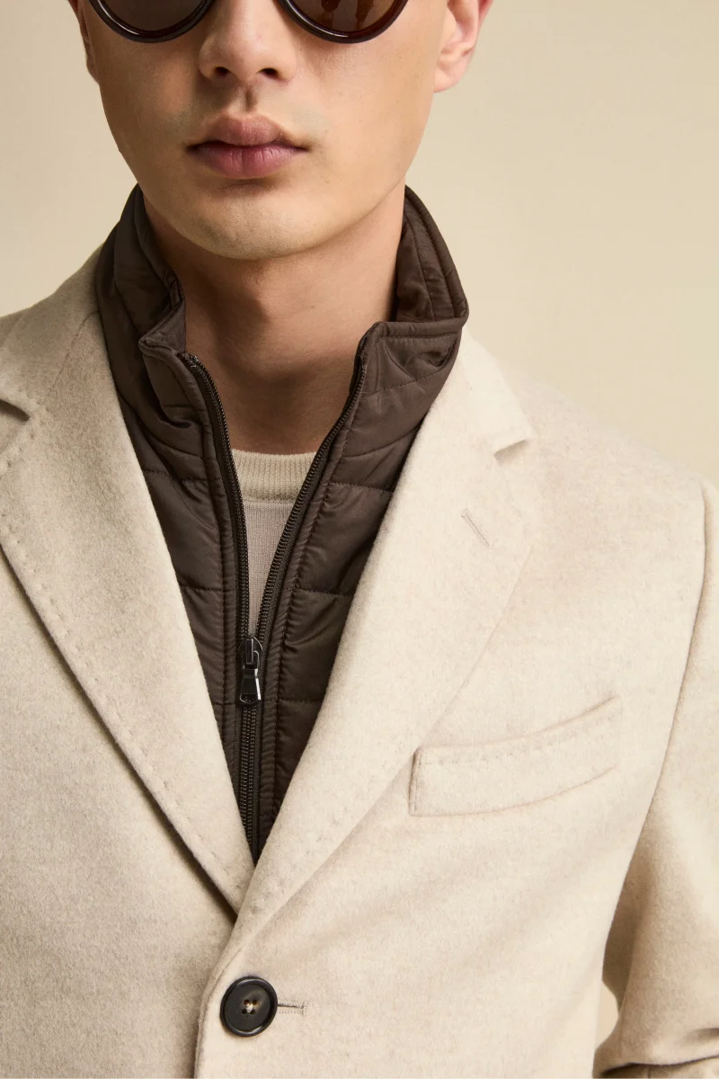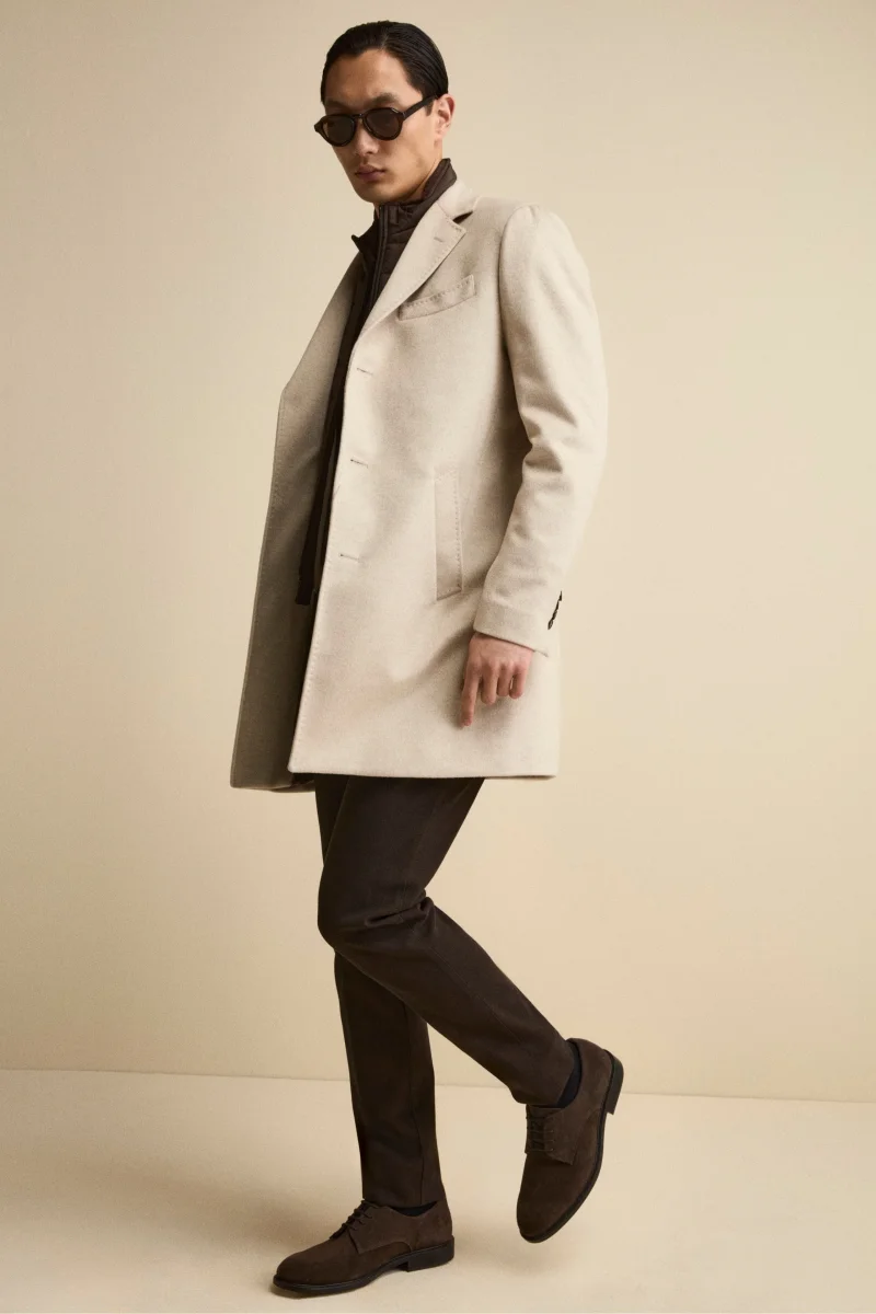Cappotto monopetto da uomo realizzato in morbida lana e cashmere con revers a lancia, spalle strutturate, abbottonatura monopetto e tasche applicate frontali. Si caratterizza per la pratica pettorina imbottita staccabile che ripara dal vento e freddo. Il cappotto modello baronetto รจ il capospalla icona del Lanificio, disponibile nei classici colori intramontabili. Made in Italy. Il modello รจ alto 189 cm e indossa la taglia 50.