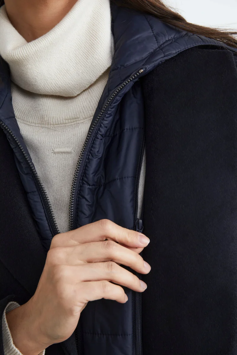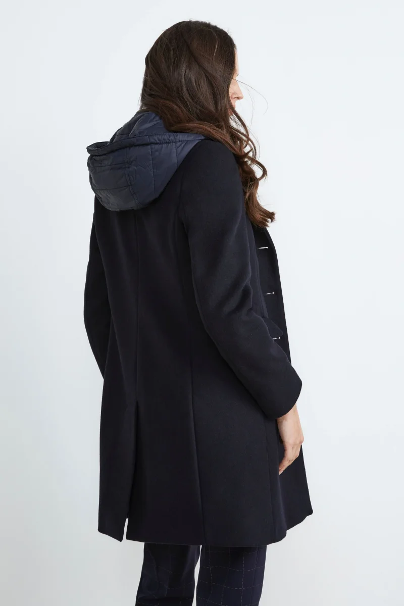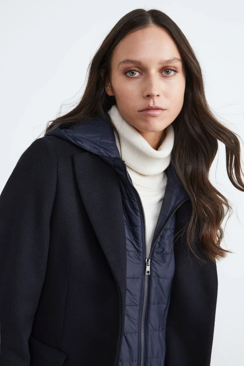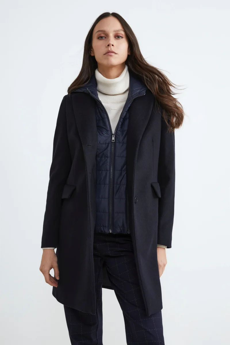 Cappotto da donna in misto lana e cashmere, vestibilitร asciutta. Comprende una fodera interna con cappuccio removibile e presenta una chiusura monopetto con tre bottoni e tasche a filetto con pattina. Lunghezza media. Indossalo con un caldo dolcevita in cashmere per il massimo della morbidezza. Disponibile in piรน varianti colore e made in Italy. La modella รจ alta 178 cm e indossa la taglia 40.