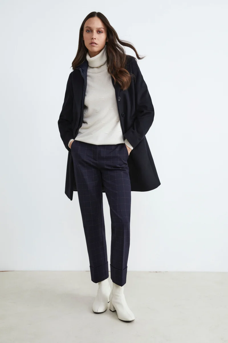 Cappotto da donna in misto lana e cashmere, vestibilitร asciutta. Comprende una fodera interna con cappuccio removibile e presenta una chiusura monopetto con tre bottoni e tasche a filetto con pattina. Lunghezza media. Indossalo con un caldo dolcevita in cashmere per il massimo della morbidezza. Disponibile in piรน varianti colore e made in Italy. La […]