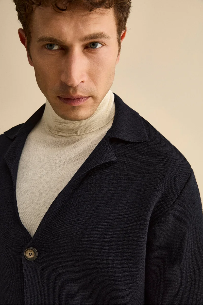 Cardigan con Tasche e Bottoni in Misto Lana da uomo, un capo versatile e raffinato, realizzato in pregiato misto lana per offrire comfort e calore durante la stagione autunno inverno. Caratterizzato da un design con colletto a revers classico, tasche frontali applicate e chiusura con bottoni, presenta una vestibilitร regolare che lo rende perfetto sia per look casual eleganti che per outfit piรน rilassati. Questo cardigan uomo in lana con bottoni fa parte della collezione Il Lanificio ed รจ un must-have per il guardaroba maschile contemporaneo, ideale da abbinare a camicie, pantaloni chino o denim per creare combinazioni sofisticate e senza tempo. Made in Italy. Il modello รจ alto 189 cm e indossa la taglia 50.