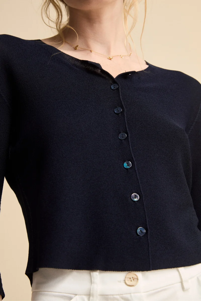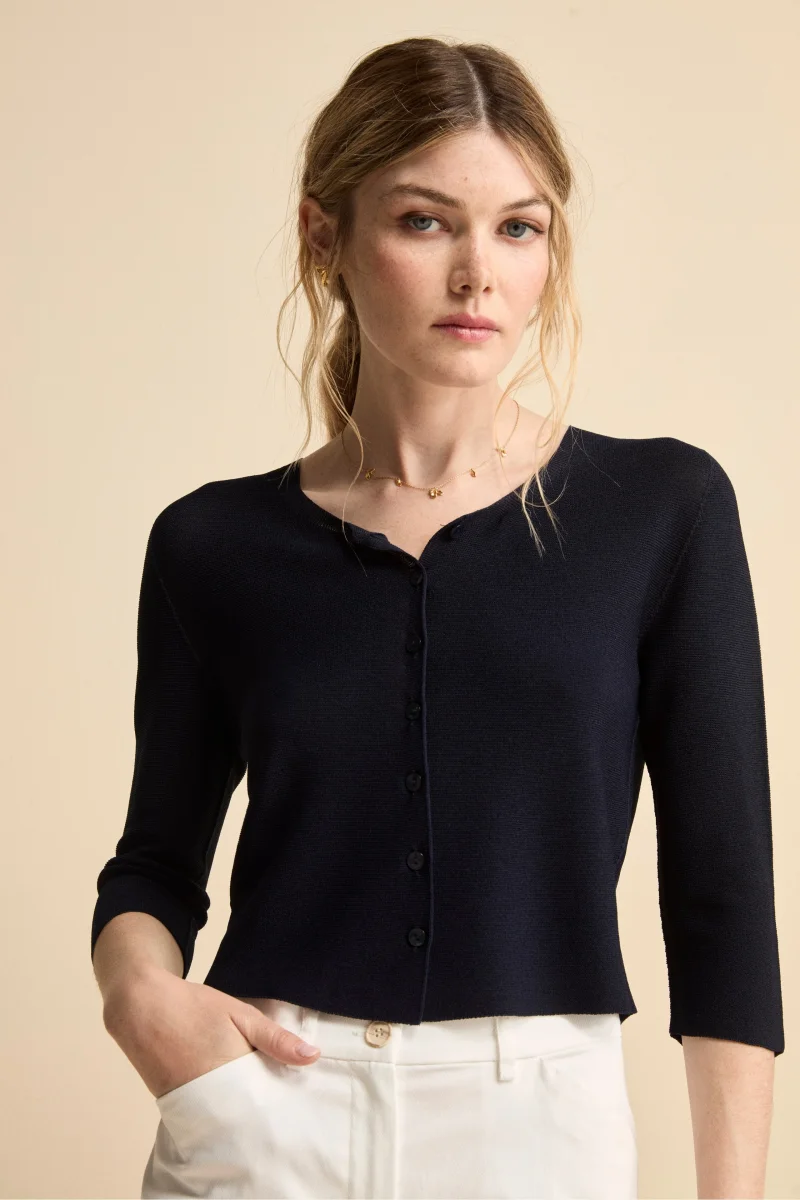Cardigan cropped in viscosa. Realizzato con collo alla coreana, manica a tre quarti e lavorato in maglia con lavorazione links. Versatile e attuale. Ideale per giocare con infiniti abbinamenti, sopra il jeans a vita alta o elegante sopra un tubino. Made in Italy. La modella indossa la taglia 40.