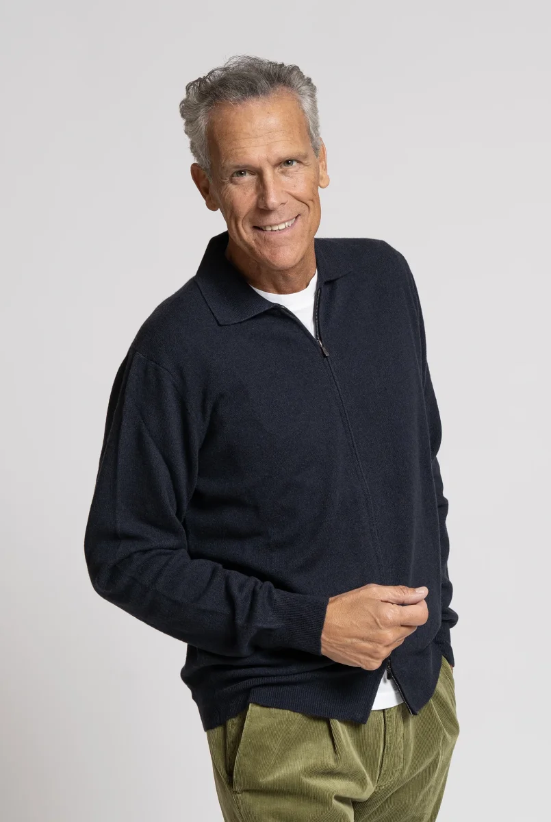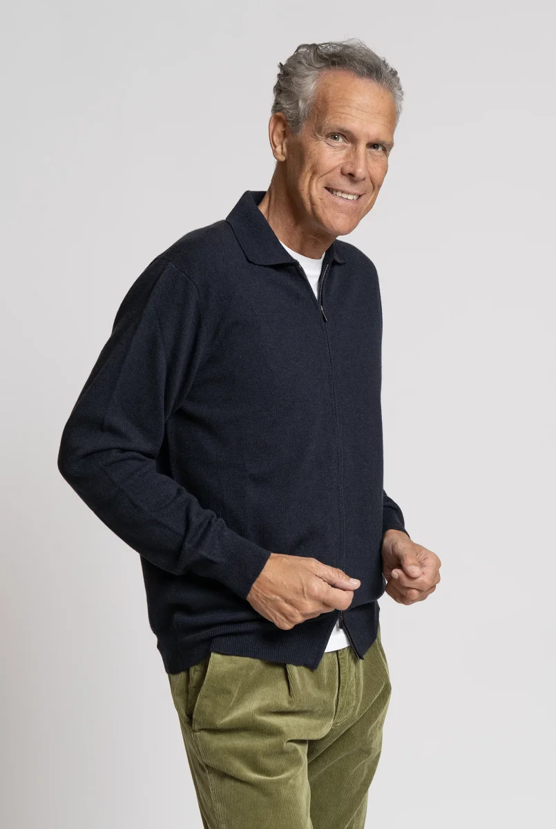 Pregiato cardigan in misto cashmere, realizzato in Italia con maestria artigianale. Il design presenta zip frontale, colletto classico e una linea essenziale che unisce comfort e raffinatezza.