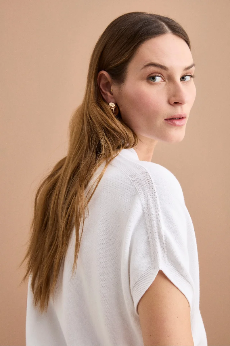 Cardigan kimono in cotone da donna, un capo versatile dal design contemporaneo, ideale per completare look casual chic con leggerezza e stile. Realizzato in 100% cotone, presenta vestibilitร over e linea crop che valorizza le proporzioni, mentre la mezza manica a kimono dona morbidezza alla spalla e unโallure rilassata. Lo scollo a V con chiusura frontale a bottoni definisce unโestetica essenziale, completata dai bordi a costine e dagli spacchetti laterali che aggiungono comfort e movimento. Parte della collezione Il Lanificio e interamente Made in Italy, si abbina perfettamente a pantaloni a vita alta o denim straight per un look quotidiano raffinato, oppure sopra abiti e top leggeri per uno stile femminile e contemporaneo. La modella รจ alta 178 cm e indossa la taglia 42.